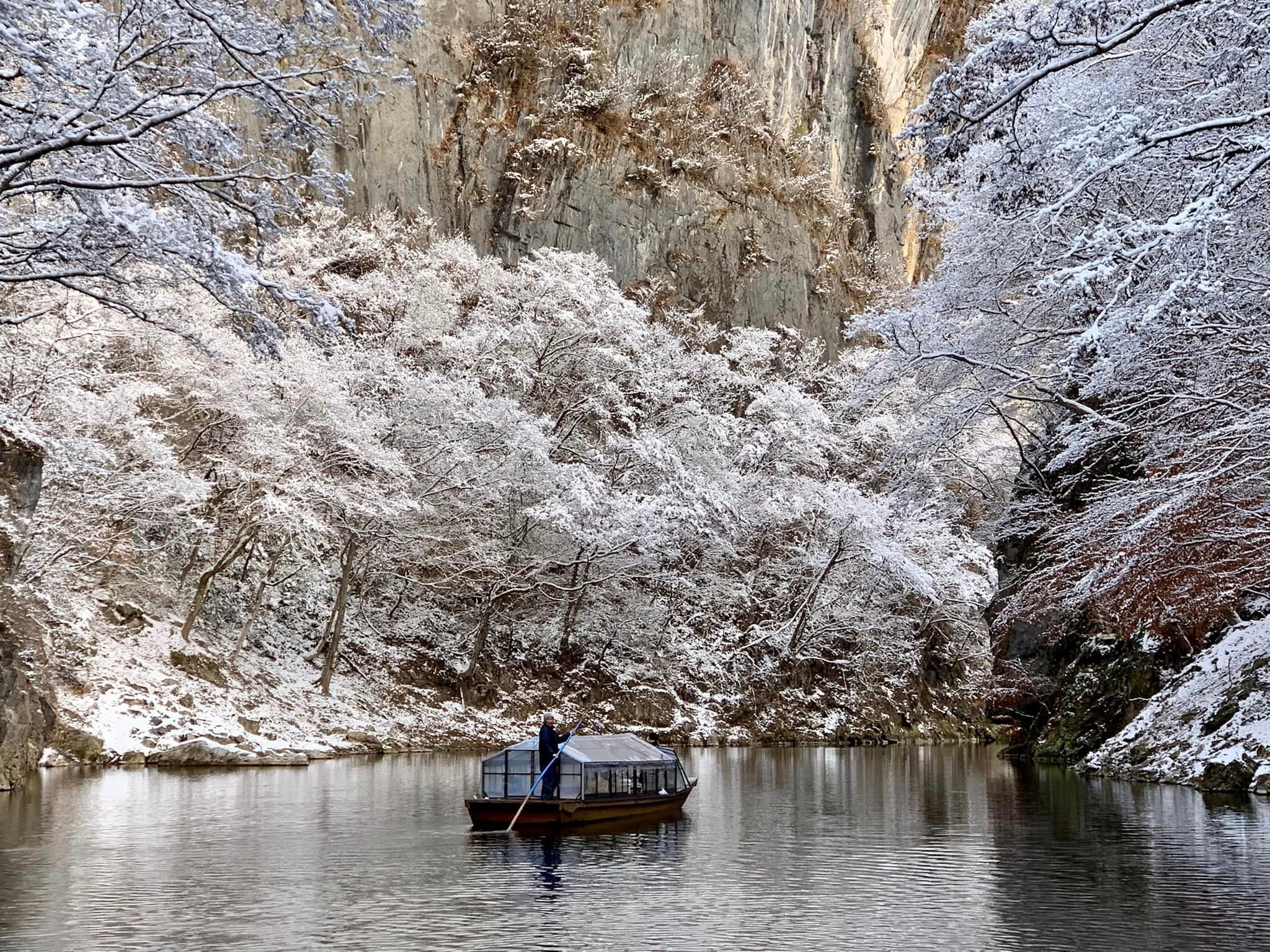 名物のお鍋をいただきながら、船で日本百景に数えられる渓谷を巡ります。