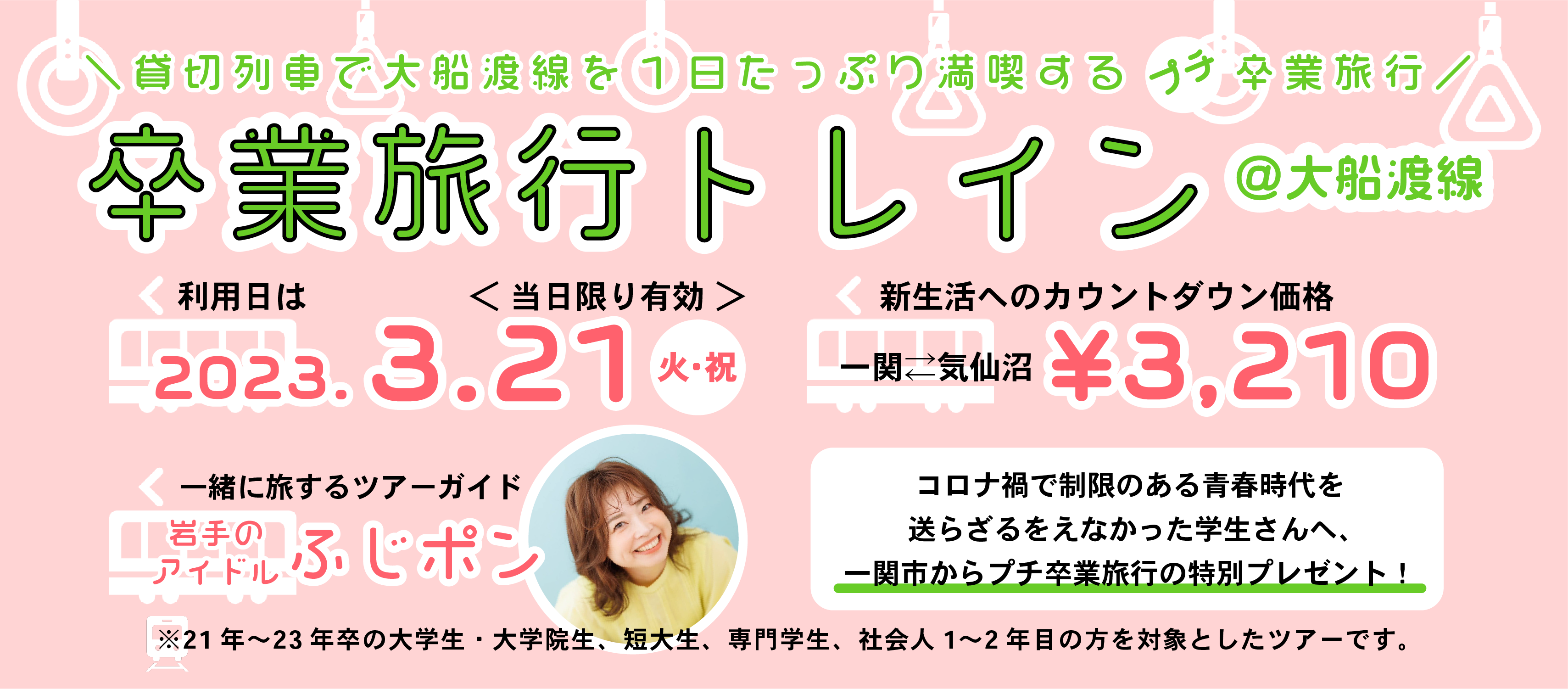 一般社団法人いわて圏(岩手県一関市、代表理事:佐藤柊平)は、一関市のJR大船渡線観光活用推進事業の一環として「卒業旅行トレイン@大船渡線」を運行します。
