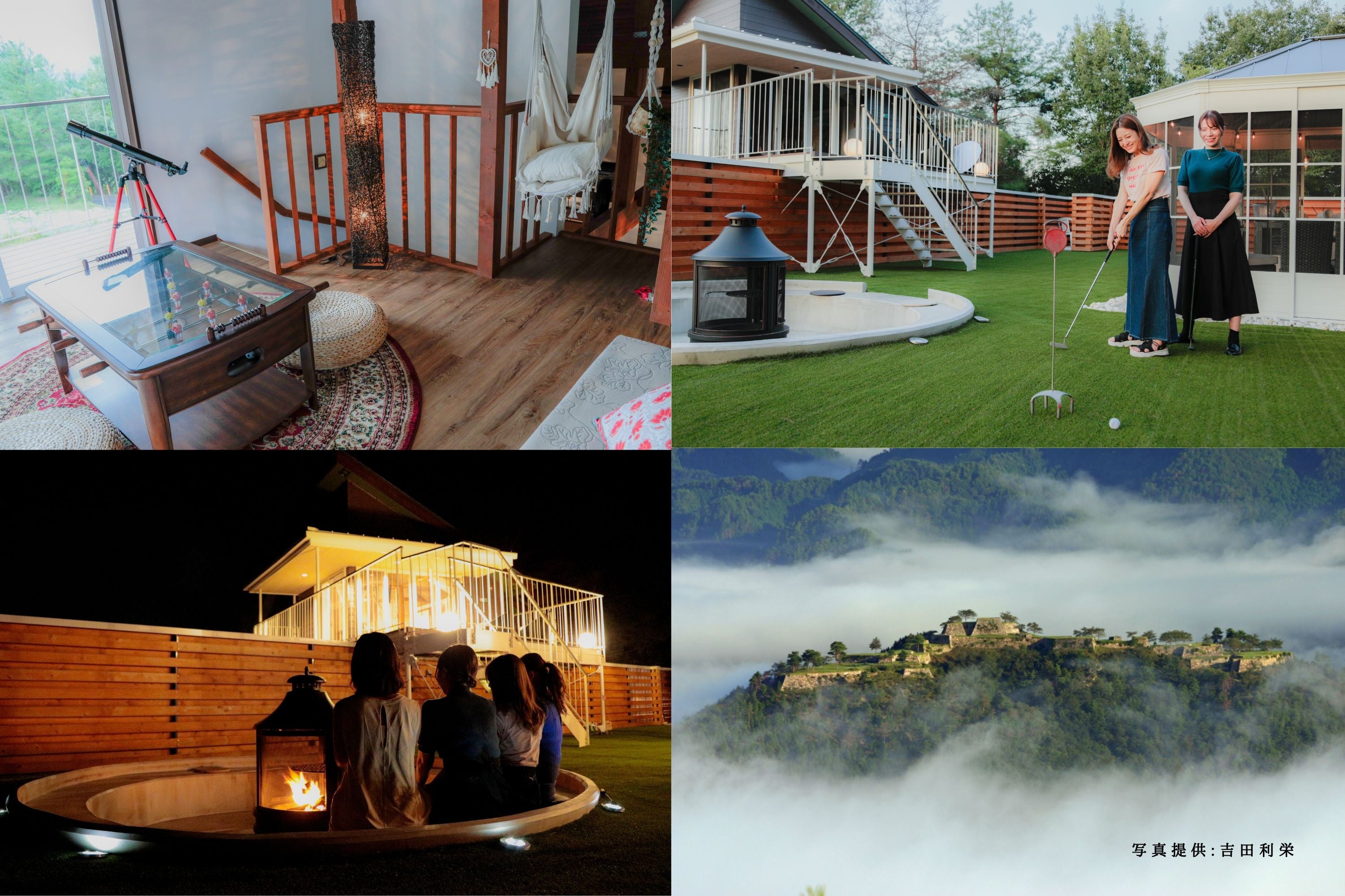 スギタクレスト株式会社(本社:大阪市、代表:杦田 勘一郎)は、朝来山東カントリークラブ(兵庫県朝来市)のコース内を横断したその先に、石垣の上にそびえ立つ、竹田城跡を彷彿させるプライベート空間の1棟貸しグランピング宿泊施設をオープン致しました。