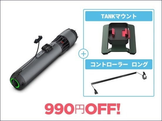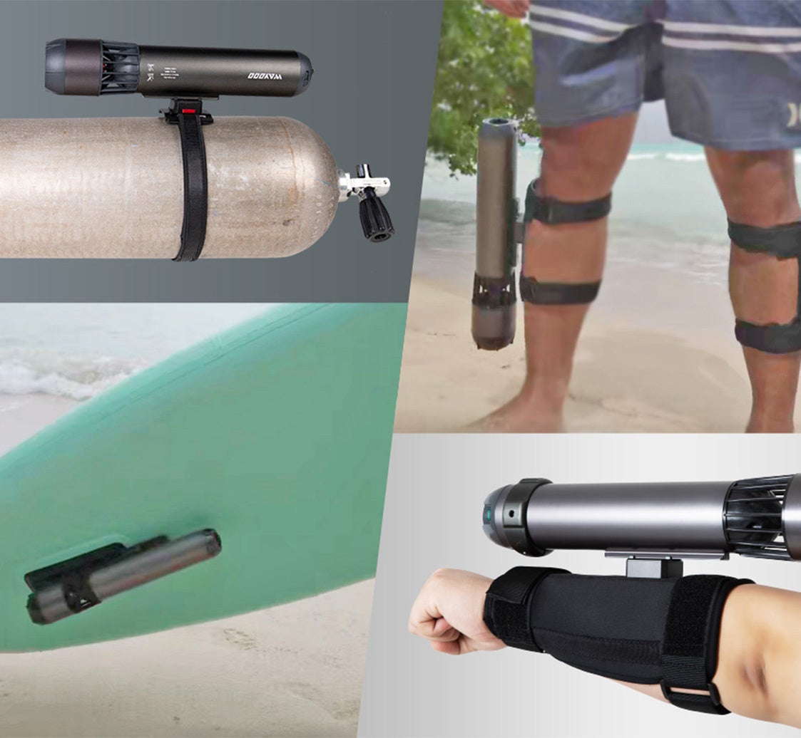 腕や足、タンクに搭載する事で両手が自由になり、より快適な水中移動を可能にしています。
