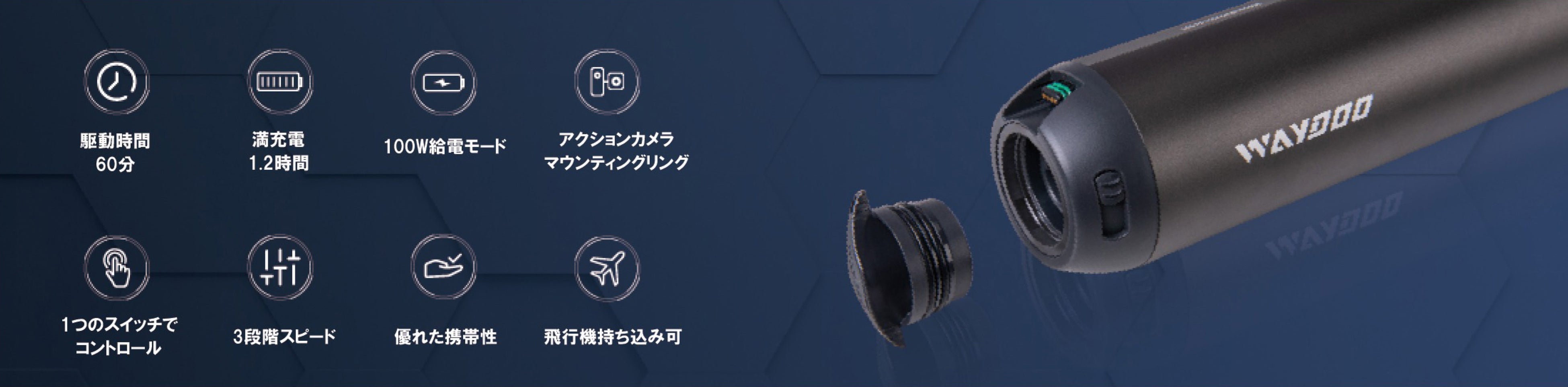 subnado は重さ1.4kg、長さ38cm、幅7cmと非常にコンパクトな水中スクーターです。98Whのバッテリーは内蔵型で、飛行機への持ち込みも可能なサイズです。