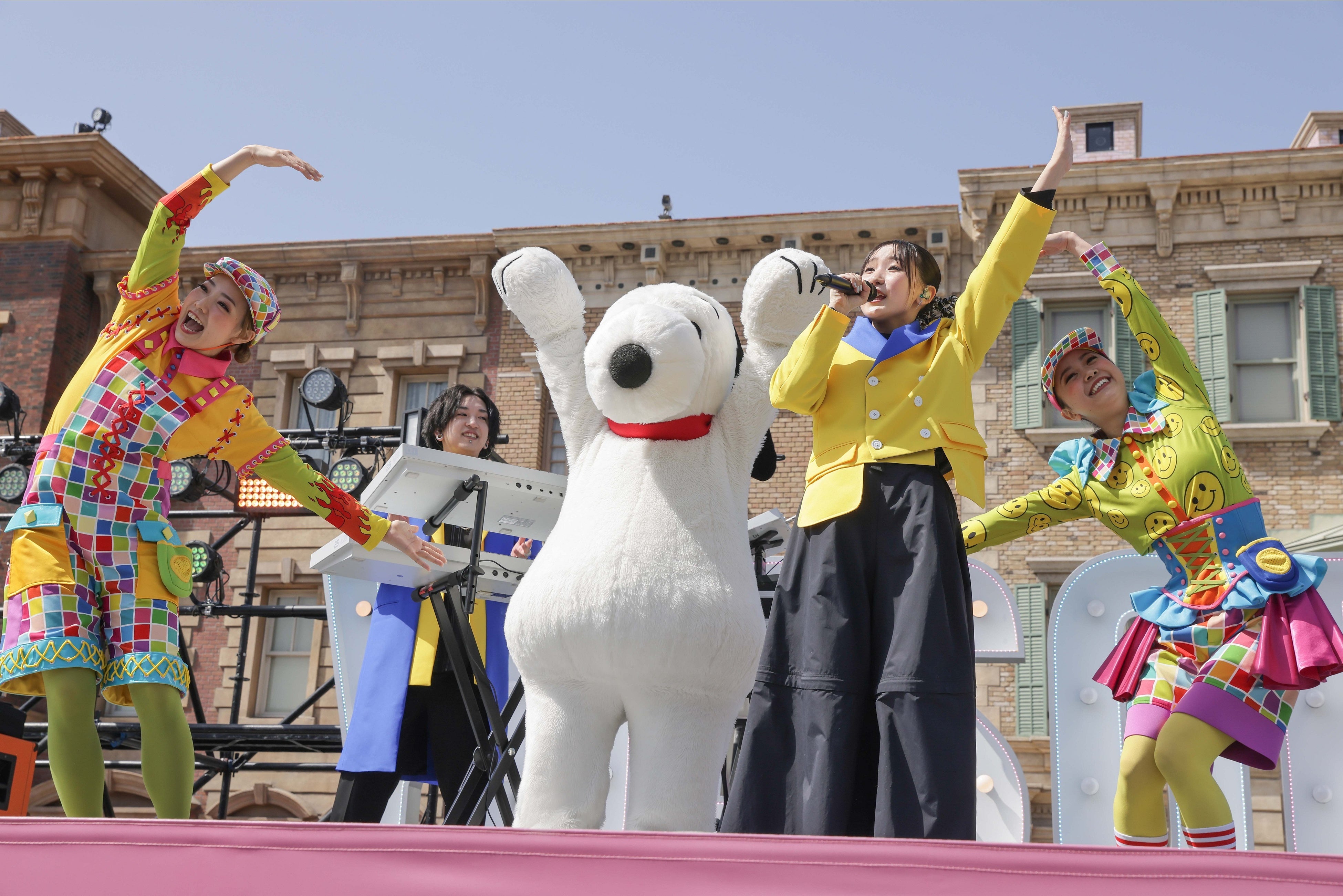 そして、ikuraさんの「サプライズゲストの登場です!」の声に会場から歓声が起こるなか、ハローキティが登場。昨年パーク内で実施していたストリート・エンターテイメント『ハローキティ・ハピネス・ブラスバンド』 でもハローキティが歌い大人気だった「ラブレター」のイントロが流れると、ユニ春ライブ限定のコラボレーションに会場からは再び歓声が起こりました。