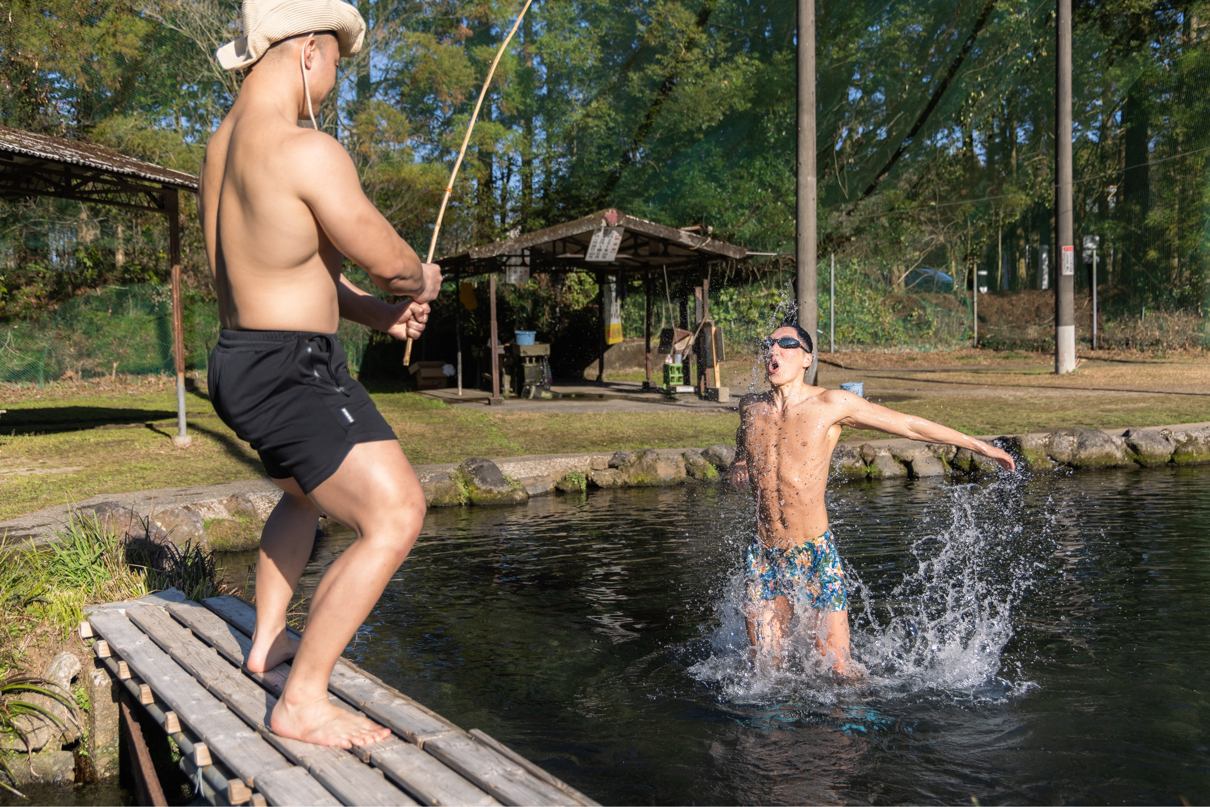 「ニジマスの釣り堀で大物が釣れたマッチョ」