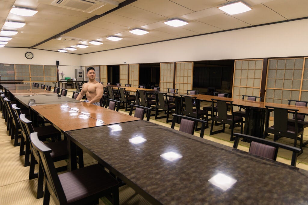「広い宴会場に一人だけ通されたマッチョ」