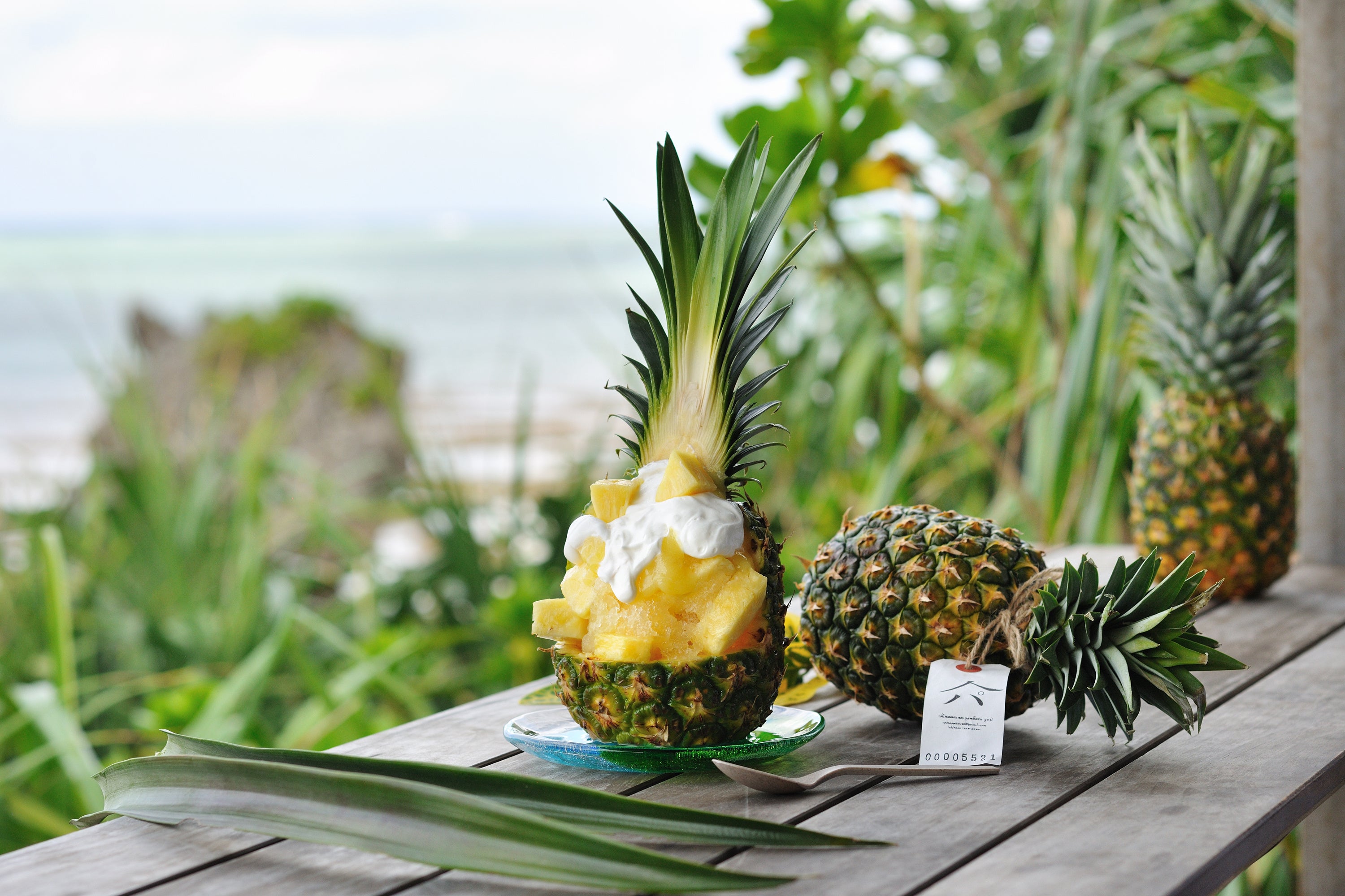 樽のような見た目のゴールドバレルは、甘い香りと味わいを持ちながら、パイン特有の酸味やえぐみが少ない、甘くて果汁たっぷりのパインです。「まるごとパインのかき氷」では、福井さんが育てるジューシーなゴールドバレルを丸々1つ分使い、果汁で作ったかき氷とごろごろの果肉を味わいます。また、芯ごと味わえる特徴を活かし、器には果肉をくり抜いた果皮を使用するほか、パイナップルの葉を活用したスプーンやストローを使用し、余すことなくパイナップルを楽しみます。