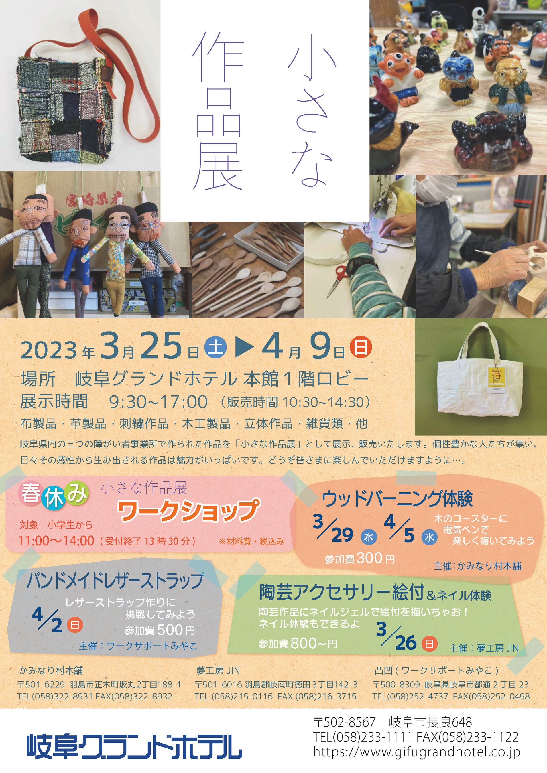 〇今回の作品展には、前回同様、布製品、革製品、刺繍作品、木工作品、立体作品、雑貨 類の展示を予定。 毎日10:30~14:30には事業所のスタッフによる販売を実施。展示物の購 入が可能です。