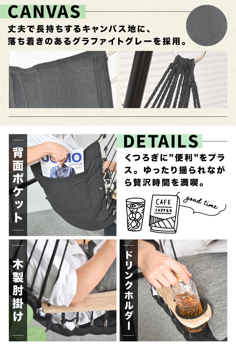 本製品は布に包まれてリラックスできるハンモックチェアです。