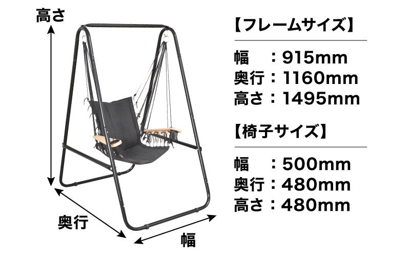 自立フレームにチェア部分を吊り下げて完成。設置面積は自立式で置き場所を選ばずお好きな所で使えます。サイズは幅915×高さ1495×奥行1160mmと省スペースでも設置可能。