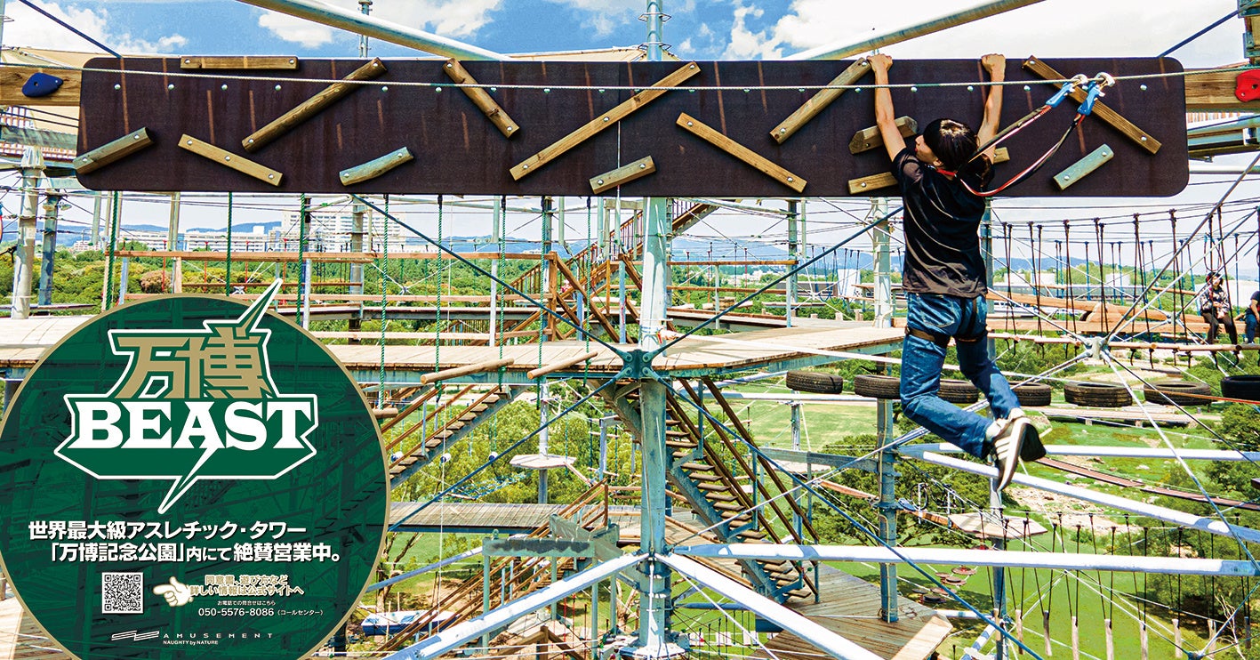 万博記念公園(大阪府吹田市)に2020年にオープンした「万博BEAST」は、世界最大級のアスレチックタワーです。