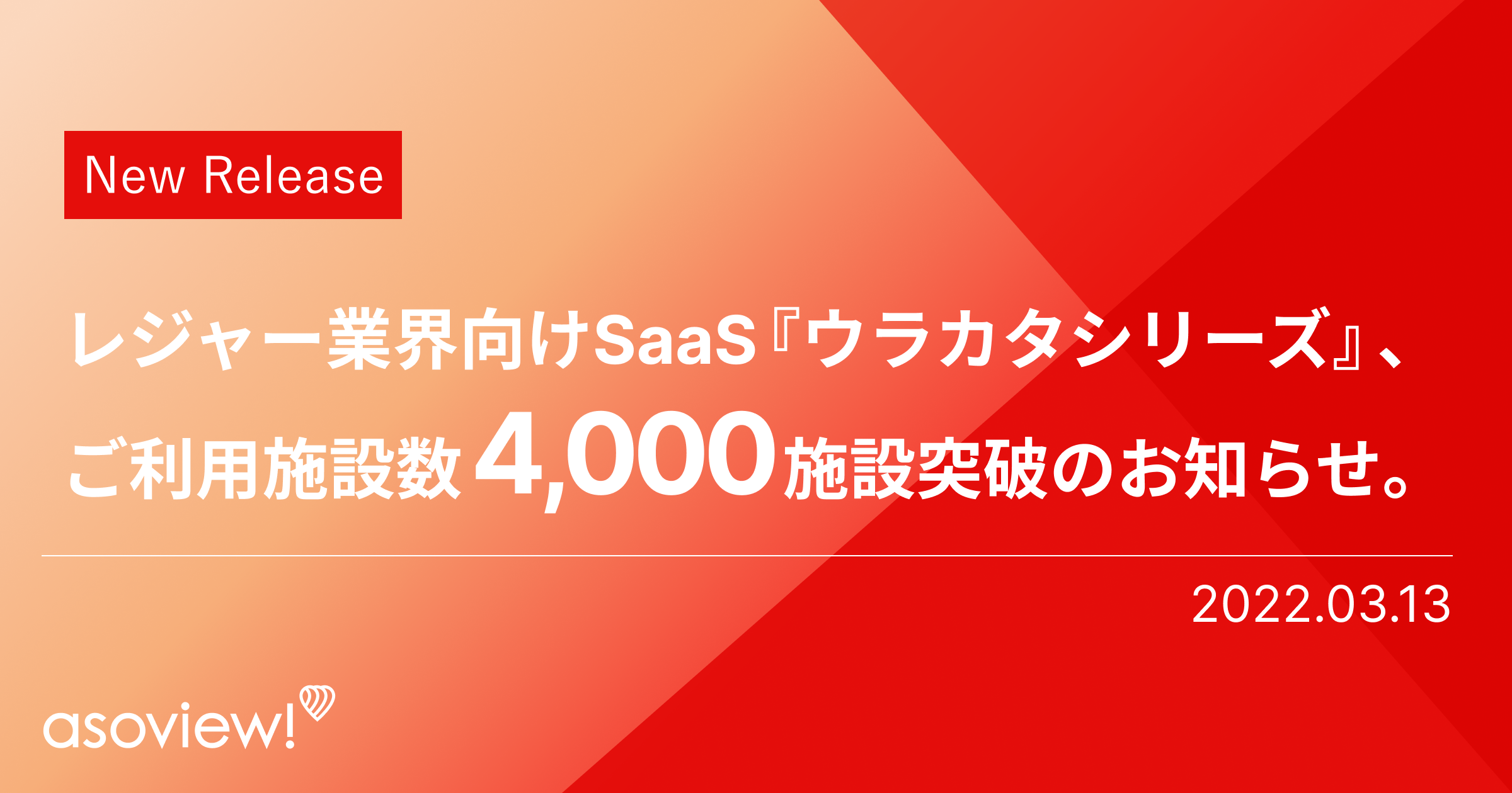 アソビュー株式会社(所在地:東京都品川区、代表執行役員CEO:山野智久、以下、当社)が2015年3月からサービス提供を開始した観光・レジャー・文化施設向けにDXを推進するSaaS「ウラカタシリーズ」は、累計ご利用施設数が4,000社突破したことをお知らせいたします。