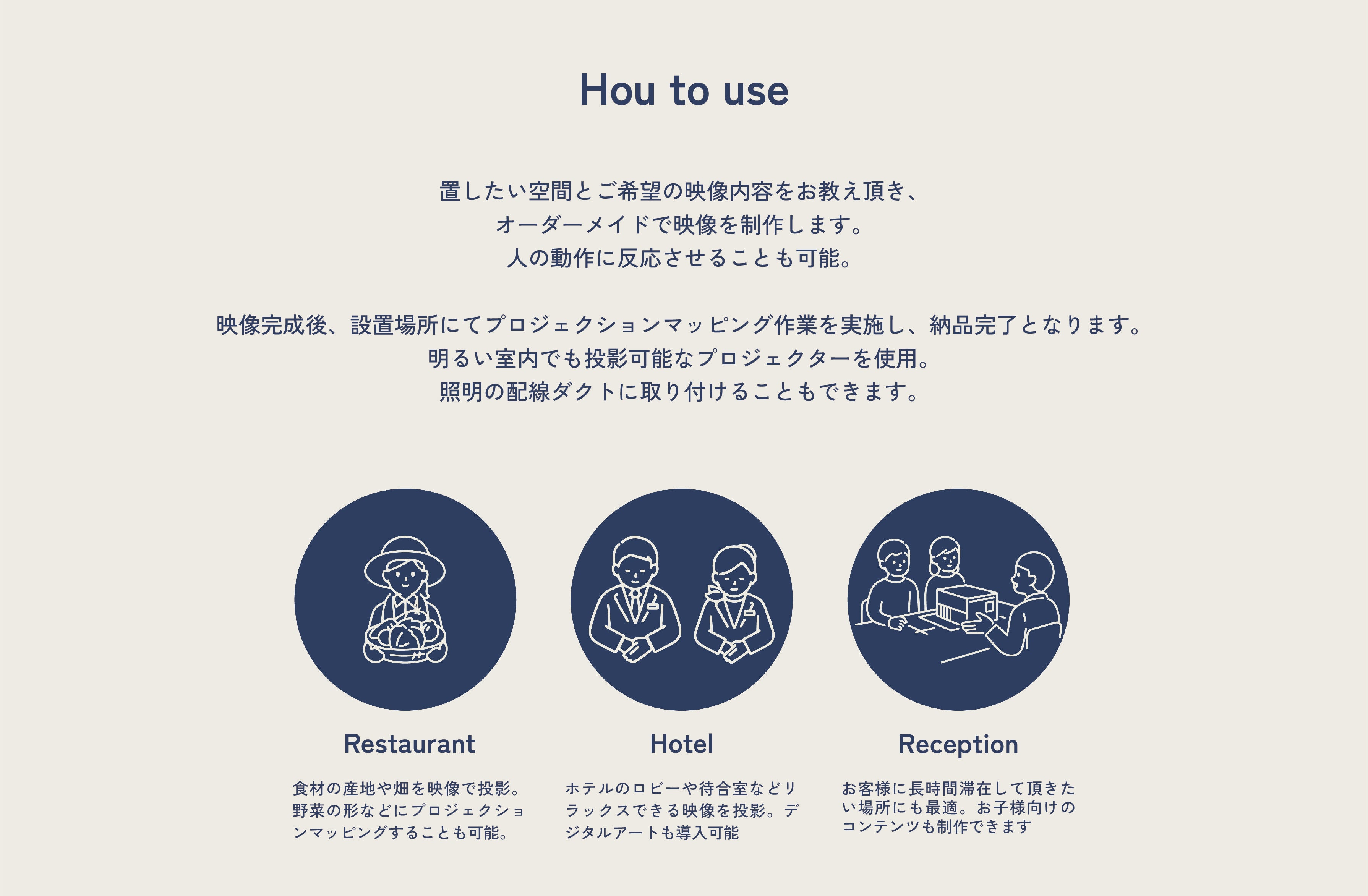 それぞれの空間に合わせて制作する、完全オーダーメイドのプロジェクションマッピング。ホテルやレストラン複合施設など、出逢う人に合わせて、映像の内容や形状をデザインします