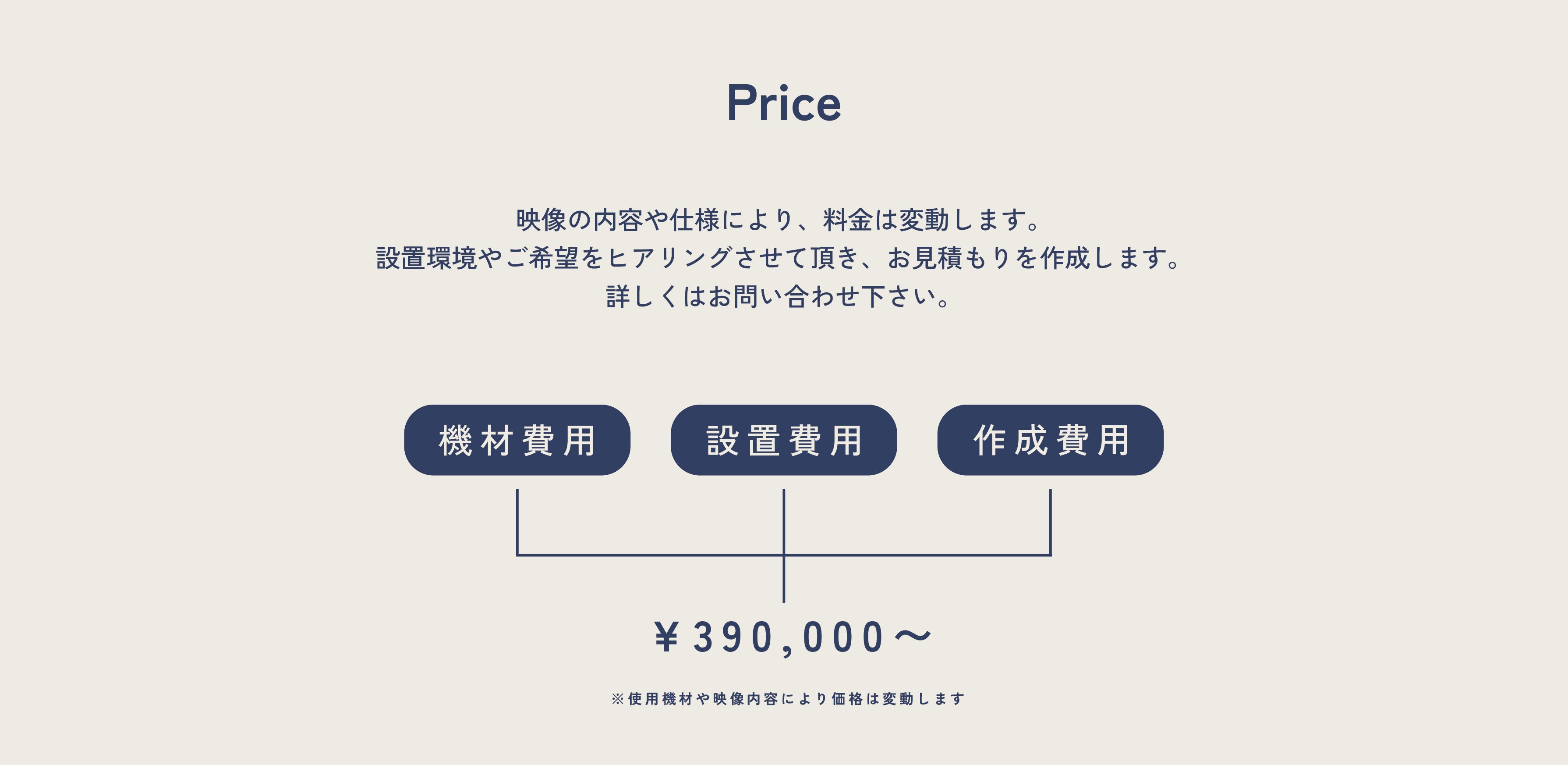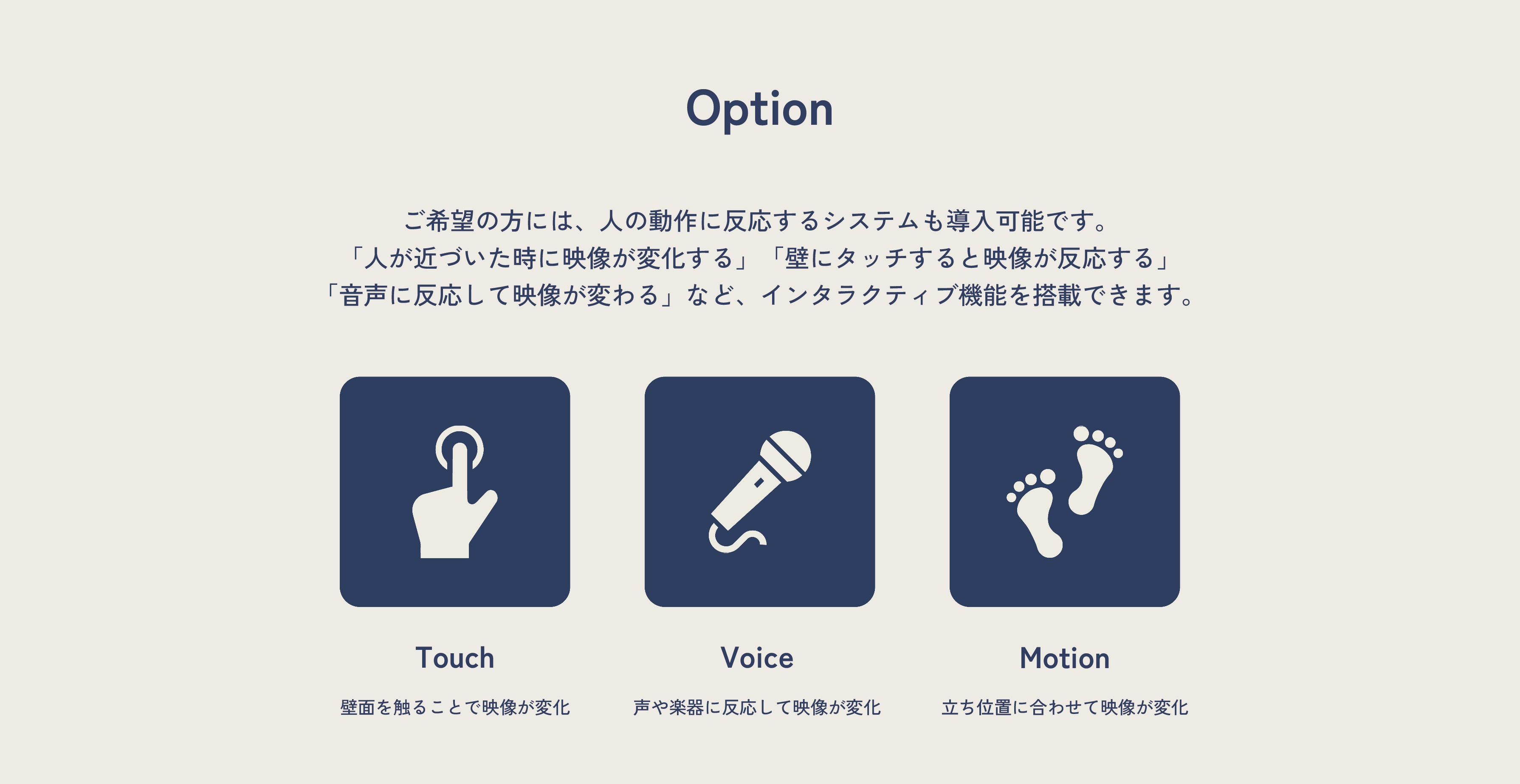 お客様それぞれに合わせてヒアリングし、映像制作を行います。場所を選ばずに、明るい空間でも投影できるプロジェクターを使用。人の動作や音声に反応する仕組みを搭載することも可能です。