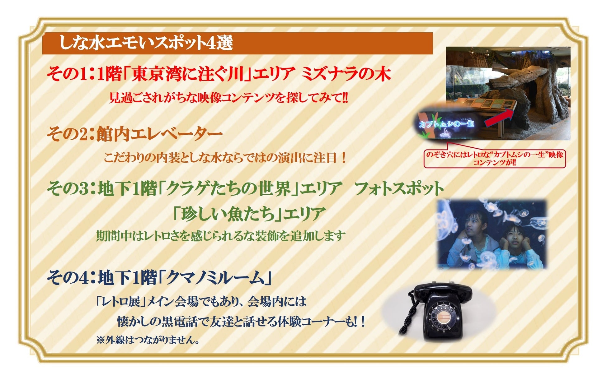 1991年(平成3年)10月にオープンし、現在もオープン当初の面影を随所に残す“平成レトロ”な水族館であるしながわ水族館にて、平成以前のレトロも含む“エモさ”を感じる展示を施します。様々な生き物たちが当時注目を集めた時代背景と共に、いま改めて、生き物が持つ魅力やブームの中に隠れた豆知識を解説。さらに地下1階「クマノミルーム」では会場を「昭和の街並み」「昭和の部屋」「平成の部屋」をイメージした3コーナーに分け、生き物の生体展示とともにレトロな空間をお楽しみいただけます。