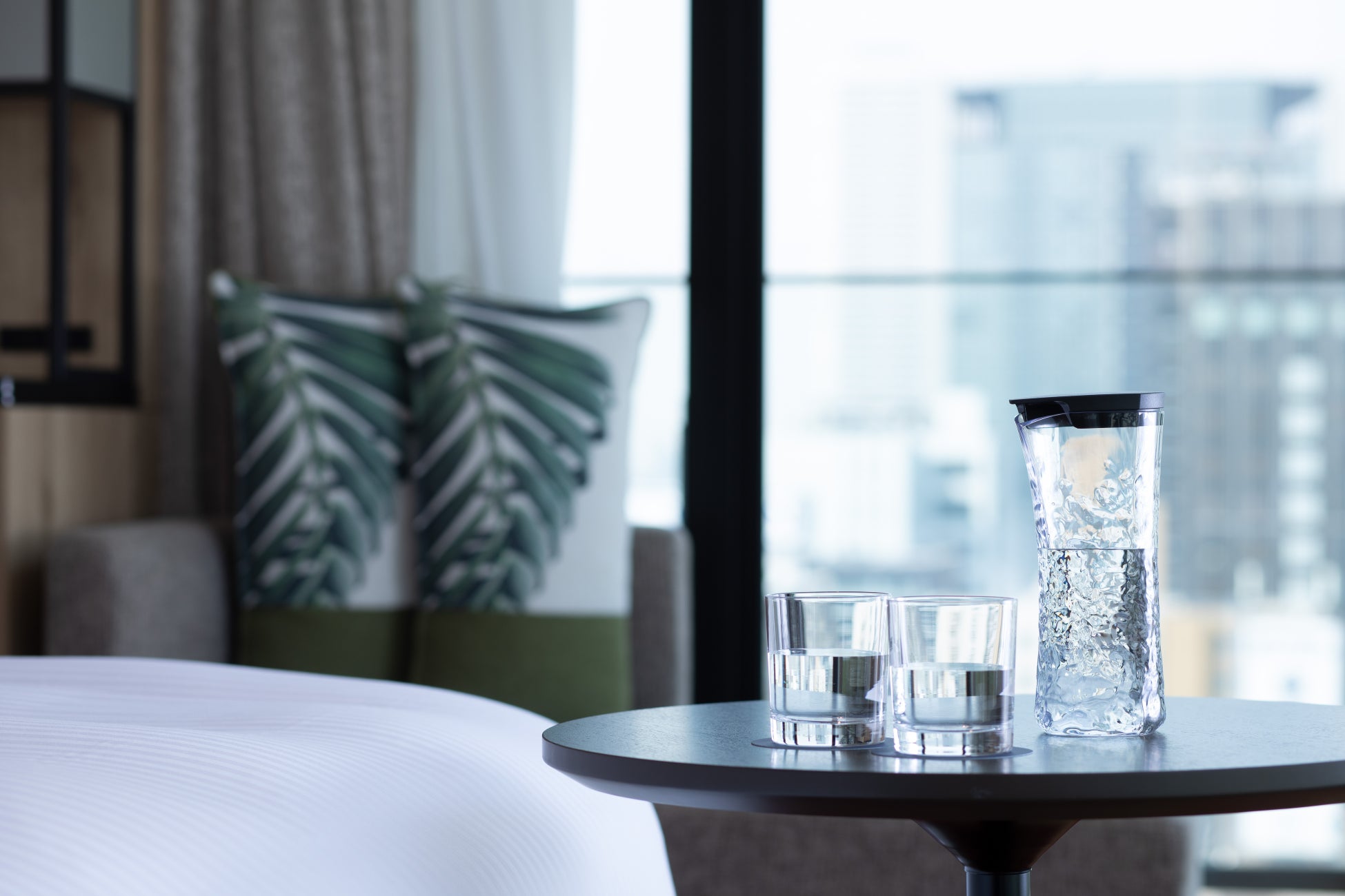 都シティ 大阪本町(所在地:大阪市中央区北久宝寺町1-8-7)では、2023年4月より、プラスチックごみの削減を目的に、客室でのペットボトル入りミネラルウォーターの提供をやめ、客室全フロアにウォーターサーバーを設置、全客室に再生樹脂使用のサステナブルなウォーターボトルを用意します。
