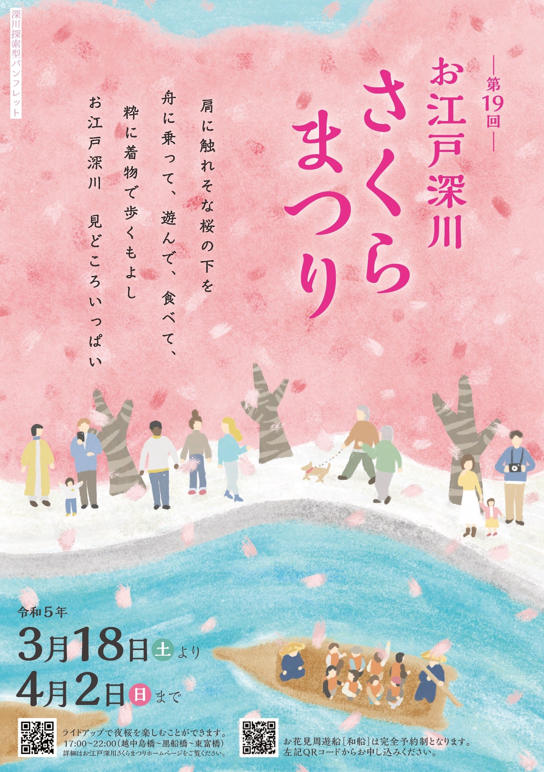 2023年3月18日(土)より、江東区深川エリアにて「第19回 お江戸深川さくらまつり」が開催されます。今年もお花見和船・動力船が運行されるほか、ガムラン演奏やJAZZライブ、マルシェやワークショップイベントなど様々なイベントを開催いたします。夜間は22時まで桜のライトアップが実施されます。江戸情緒あふれる深川の桜風景を今年もぜひお楽しみください。