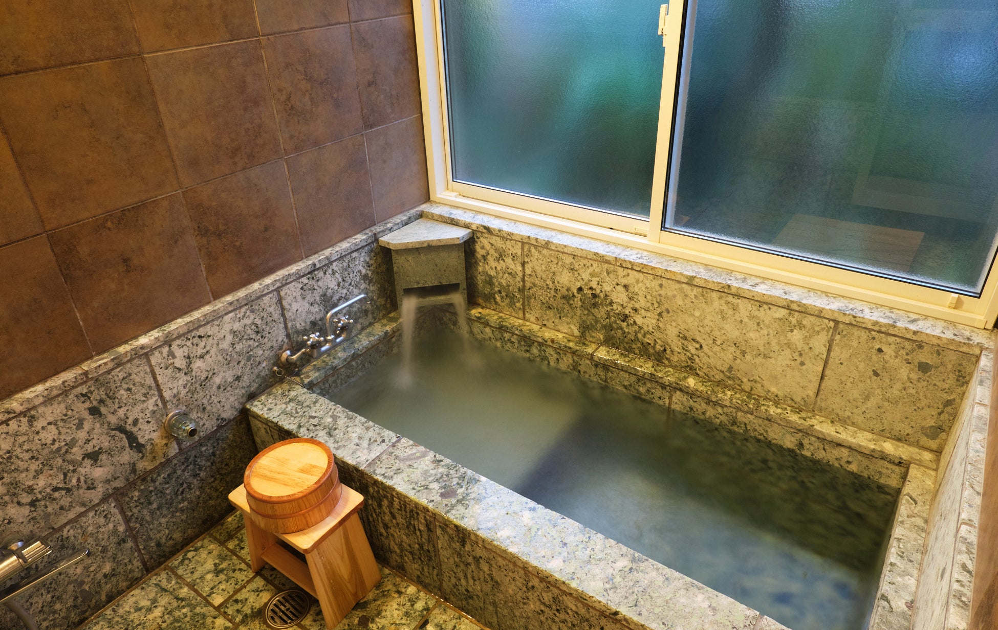 家にいながら天然温泉を楽しむことができます。浴槽の石は、江戸城の改修工事にも使われ、現在では採取不可能になった伊豆石を使用しています。