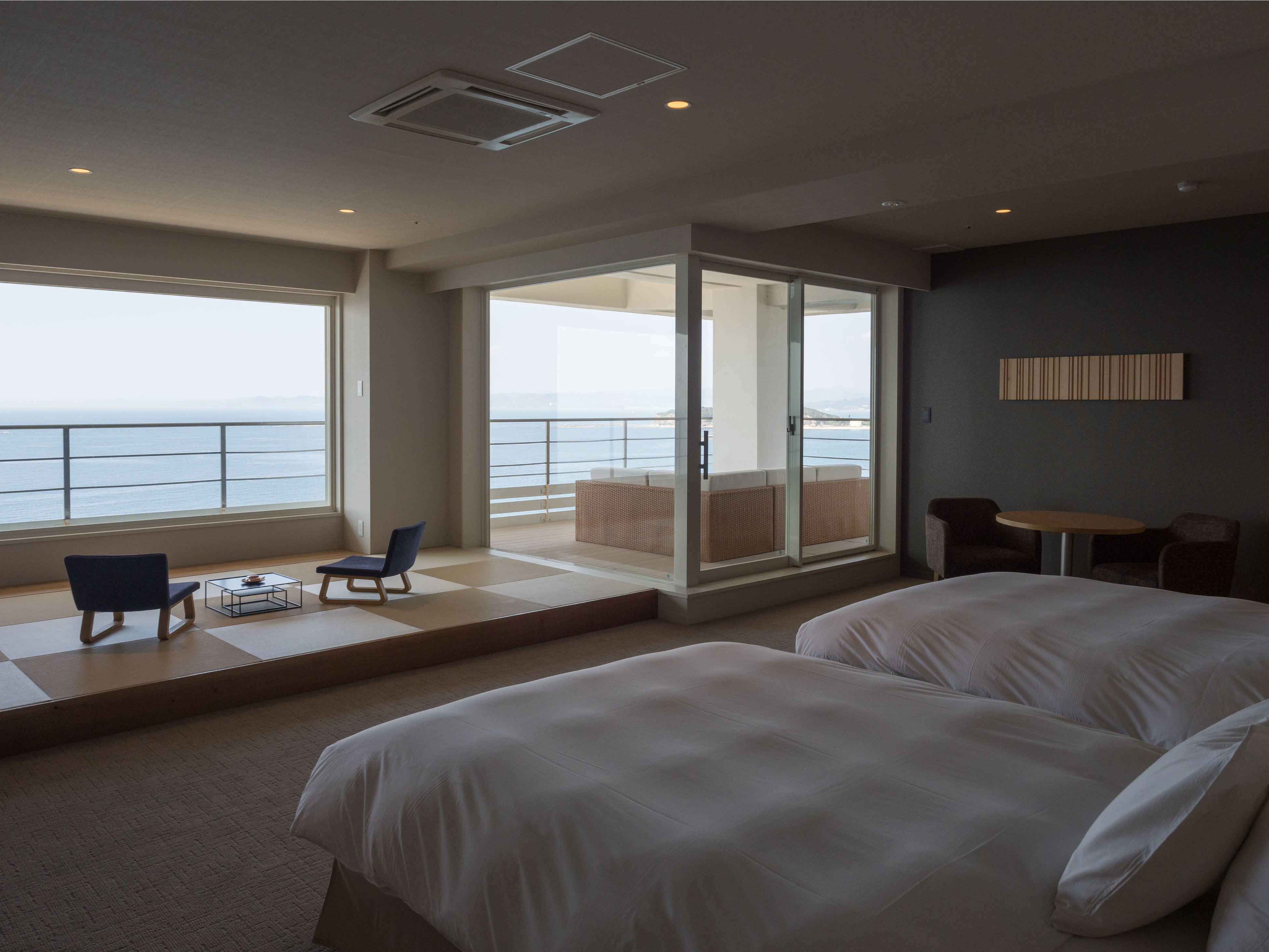 客室は160室ご用意。白浜の海を一望できるオーシャンビューの客室からは、開放感溢れる空間設計の中、海や空に溶け込んでいくような没入感を体感することができます。
