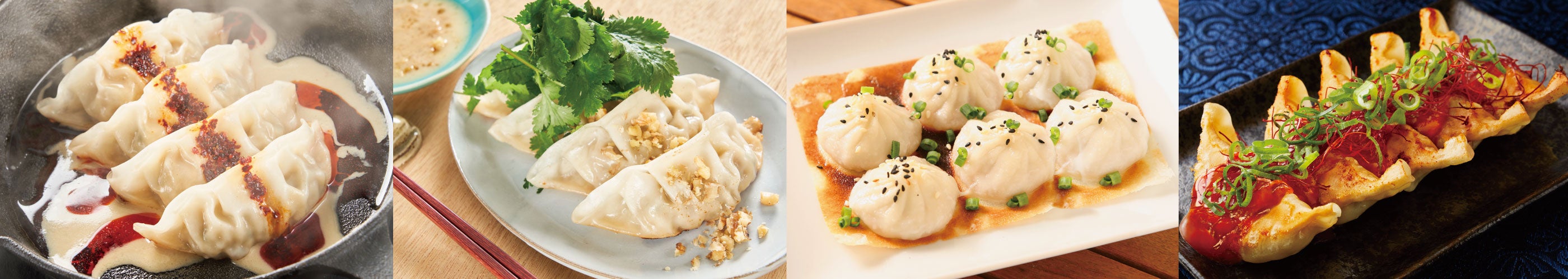 【汁なし担々麺 担担担】の自慢の味、汁なし坦々麺の魅力をギュッと詰め込んだような「担々餃子」は、特製の濃厚ごまだれにスパイスやカリカリ食感の自家製ラー油、花山椒を合わせることで、香り豊かな餃子に。パクチー好きには、パクチーと相性バッチリのごまだれとくるみが織りなす「パクチーくるみ餃子」も。 台湾屈指の人気小籠包専門店『京鼎楼』の点心師が開発した【羽根つき焼小籠包 鼎’s(Din’s)】の「羽根つき焼小籠包」は、口に入れた瞬間に飛び出す肉汁には要注意。 【餃子の宮でんでん】の新味「小江戸黒豚ヤンニョム餃子」は、埼玉県産の希少なブランド豚や、埼玉県産小麦などを厳選した国産食材のみ使用し、たっぷりの野菜を包みこんだ餃子をヤンニョムソースが引き立てる。