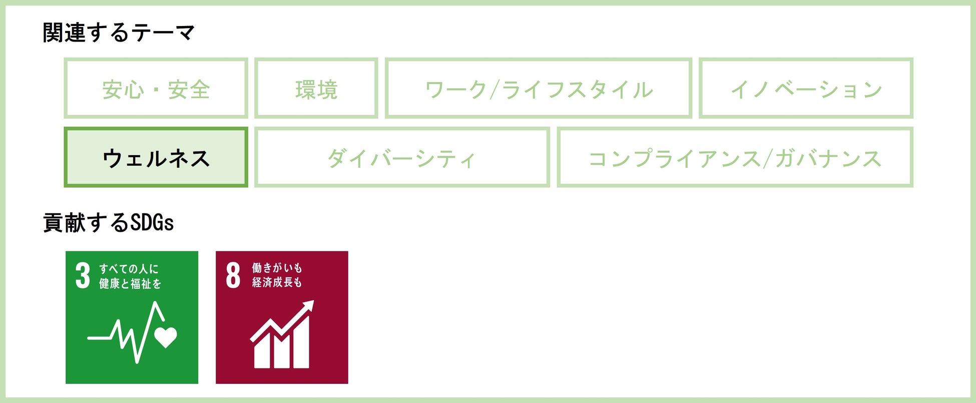 当社は、社員一人ひとりが心身ともに健康でいきいきと仕事に取り組んでいくことが重要であるという考えのもと、健康的で活力のある職場環境づくりを推進しており、サステナビリティ推進ビジョンでは「社会全体での健康経営の実現」を使命の一つに掲げています。
