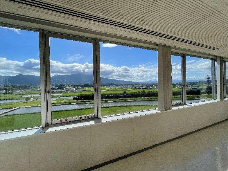 展望スペースからは、四季折々の季節の移り変わりを眼下に観ることができます。これからの季節は、遠賀川河川敷のチューリップと桜を同時に楽しむことができます。利用時間は、開庁時の平日8:30~17:00となります。