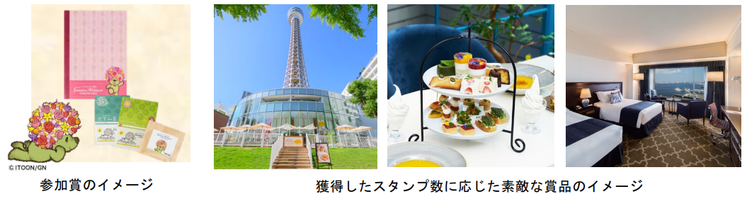 スタンプラリー参加者(先着3,000名様)にガーデンベアグッズの参加賞をプレゼントするほか、獲得したスタンプ数に応じて、抽選で観光施設招待券、商品券、ホテルペア宿泊券などの素敵な賞品が当たります。