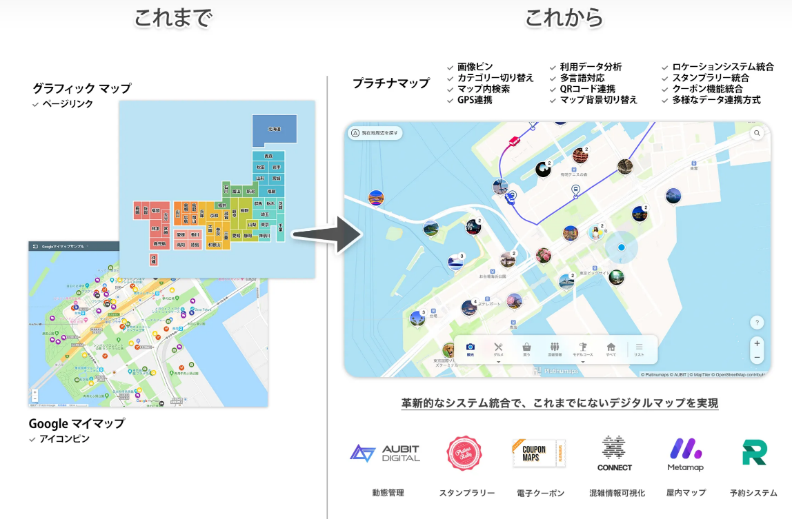 「横浜デジタルMAP」のシステム基盤として利用しているサービス「プラチナマップ」は、観光案内マップや施設案内などを多言語対応(7ヶ国語自動切換え)でデジタル表示することができ、利用データ分析も可能です。