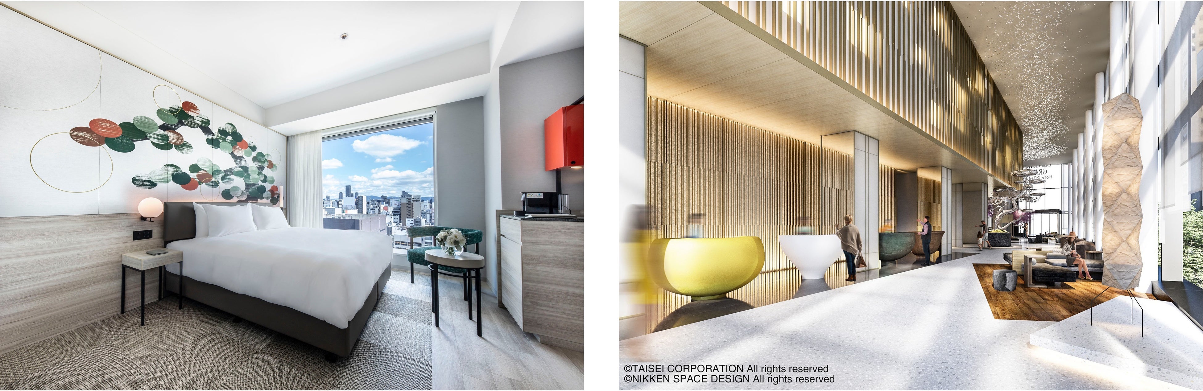 全515室の客室は6-31階にわたり3つのフロアタイプに分かれ、フロアごとに異なる大阪の景観を望むことができます。また、全てのフロアにコネクティングルームやファミリールームを備え、幅広いニーズに応じて27㎡から56㎡の広さのある様々な客室をご用意。客室のデザインは、大阪でも古くから親しまれてきた伝統芸能の代表格「能」をイメージし、各客室のベッド側の壁面には能舞台からインスピレーションを受けた「松」が描かれています。