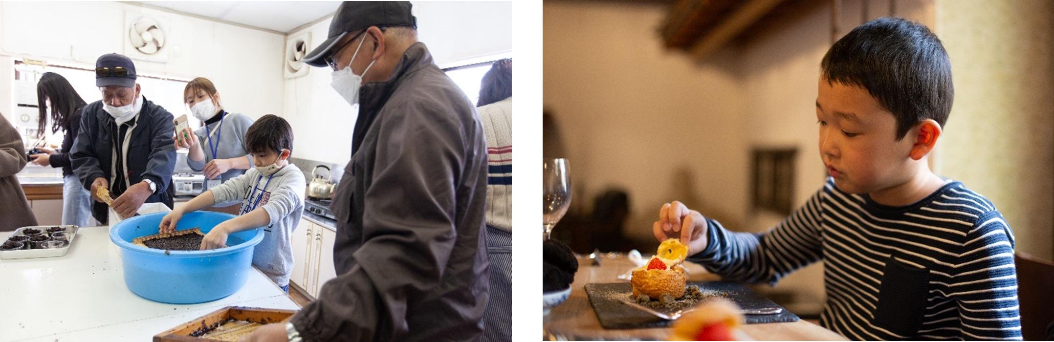 灯台からの絶景を楽しんだ後は、沢崎の特徴的な地形だからこそ自生する天然の「岩のり」を使った板のり作りを体験。集落の方たちの手ほどきを受けながら、専用の器具「のり枠」や「のりず」を使い、板のりを作っていきます。体験した方からは『おじいちゃんがやると簡単そうなのに、実際に作ると枠をおさえながら作業するのが大変!』、『一枚一枚手作業で作るのは大変!ありがたく食べないといけないなと思いました』と、感想を聞かせてくれました。体験終了後、宿根木にあるフランス料理店「あなぐち」にて、岩のりを使ったコース料理やジオ×沢崎鼻灯台をモチーフにしたスイーツを堪能。「あなぐち」を運営する菊地さんは地域おこし協力隊として今回のプロジェクトを主導した方でもあります。食後は、本日学んだ沢崎鼻灯台や佐渡のジオや体験について参加者全員で振り返ります。菊池さんから、最後の挨拶で『灯台や食などの地域の資源を活用しながら、持続可能な地域活性の活動を目指していきたい』と今後の意気込みが語られ、温かく大きな拍手の中でモニターツアーは締めくくられました。