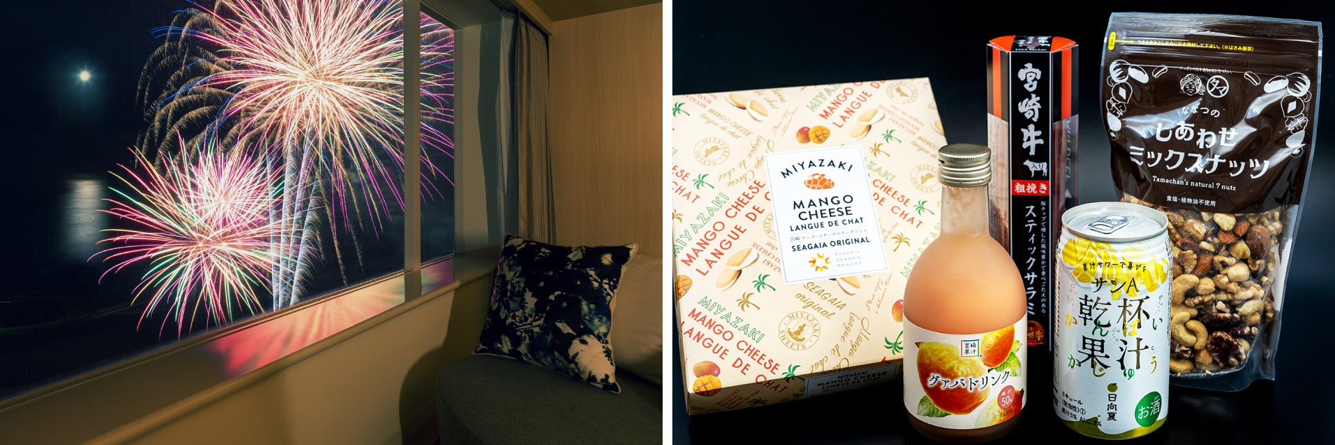 客室の中でも特に花火をきれいに見ることができる、16階以上のデラックスタイプと36階以上のプレミアムカテゴリー2タイプのお部屋をご用意した特別な宿泊プラン。花火をより楽しむ特典として、宮崎牛を使用し、桜のチップで燻しあげた「宮崎牛スティックサラミ」、宮崎を代表するローカルフルーツ”日向夏“使用のアルコール飲料「サンA乾杯果汁」や 「マンゴーチーズラングドシャ」など、宮崎を味わえるドリンク&おつまみを1部屋につき1セットご用意しました。宮崎を味わいながら、目の前で打ちあがる花火と、花火に合わせて流れる音楽の饗宴を優雅に楽しめるプランです。