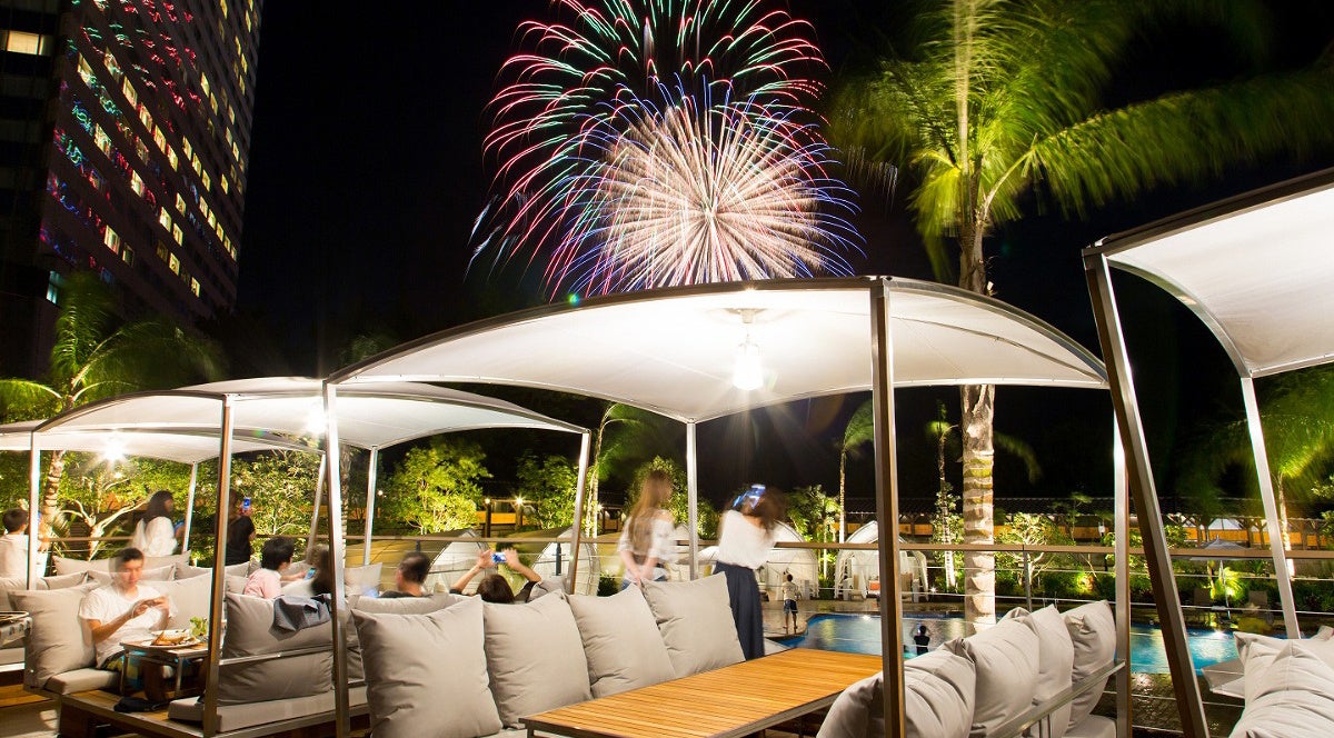 プールサイドで楽しむ、リゾートならではの花火と音楽のコラボレーション