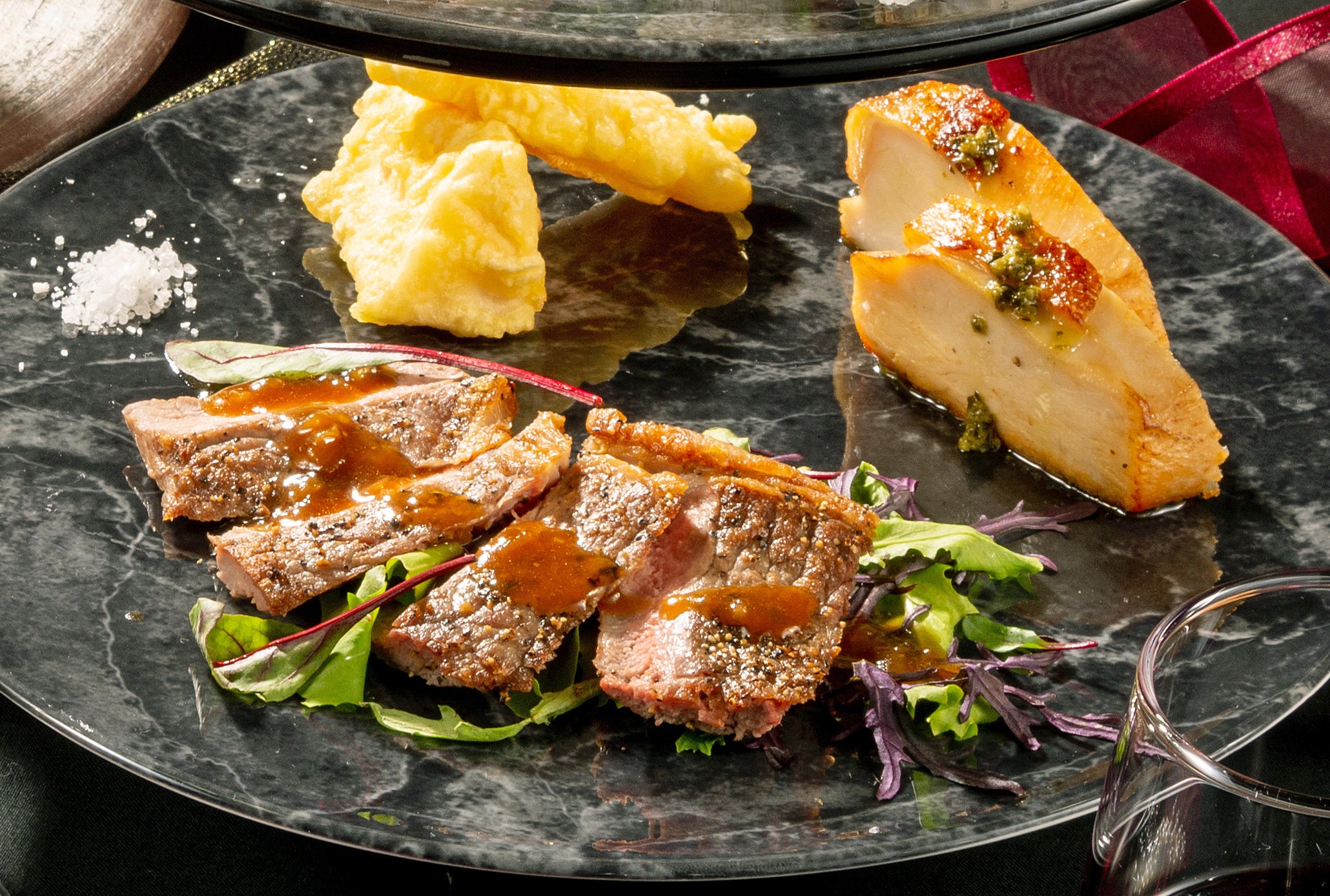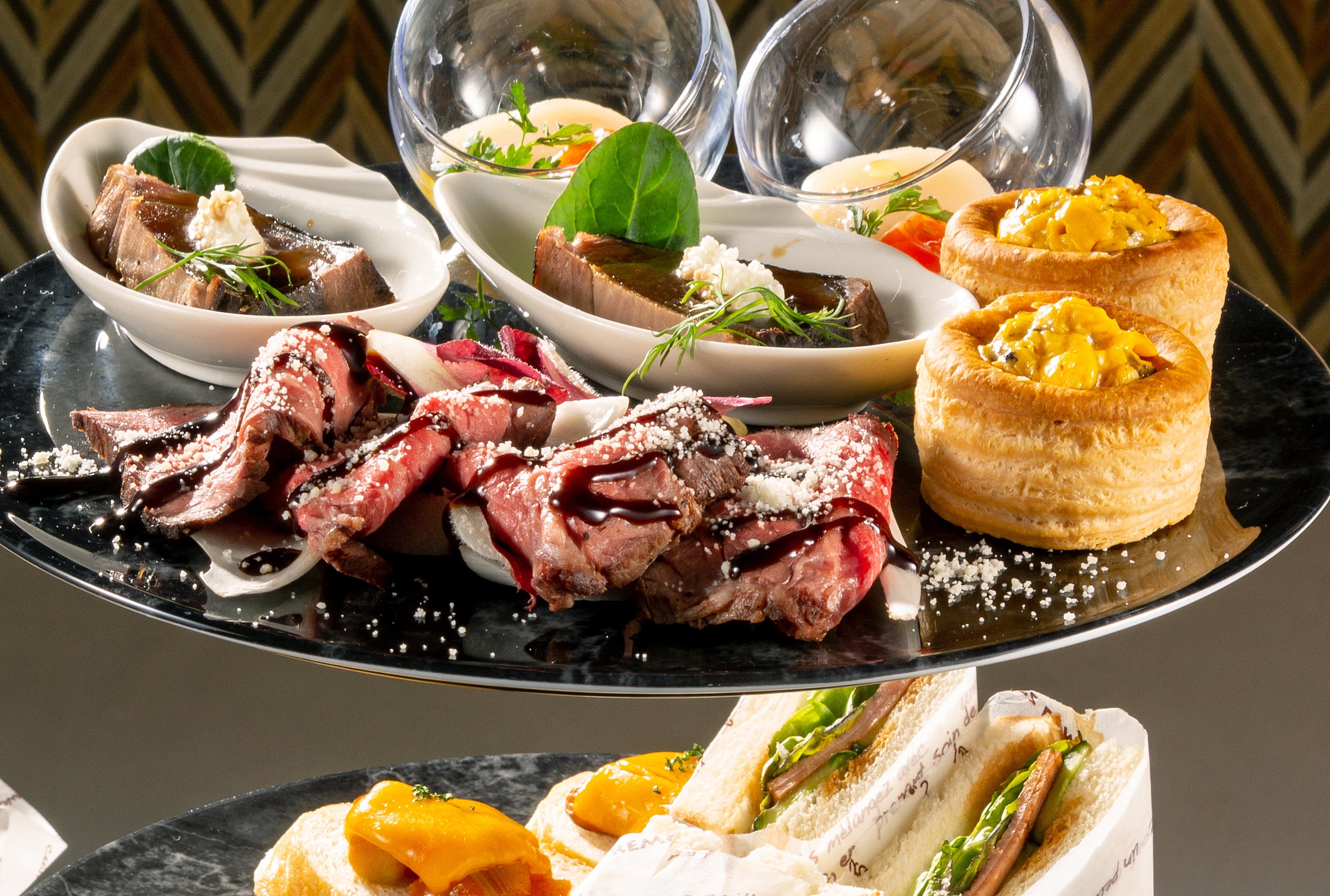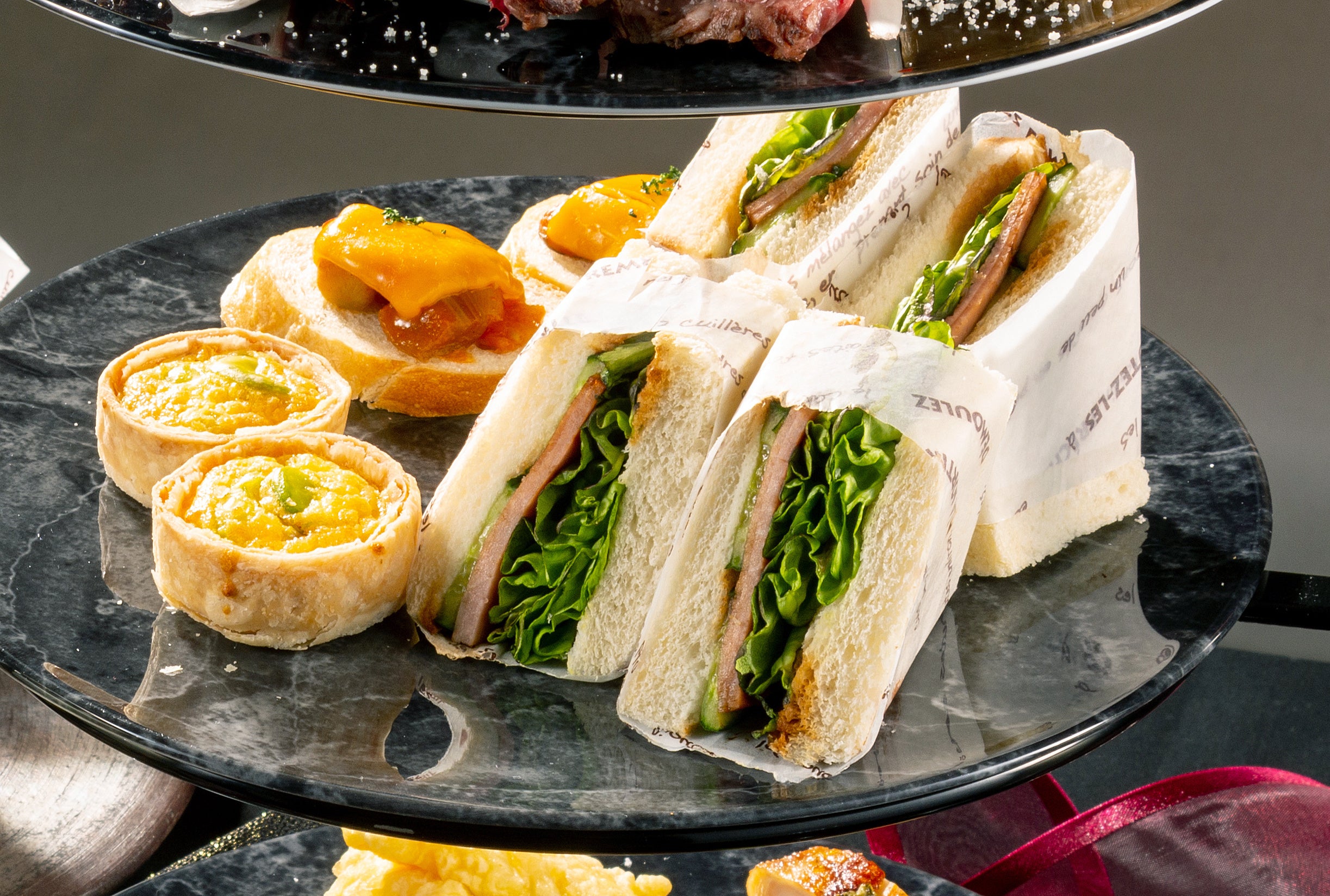 スタンドの上段には「帆立貝のマリネ」や「タリアータ」などのフィンガーフード、中段にはボリュームたっぷりの「ハムサンド」や「空豆のキッシュ」などの軽食を。そして下段には「牛リブステーキ」や「チキンのロティ」などの肉料理をご用意しました。