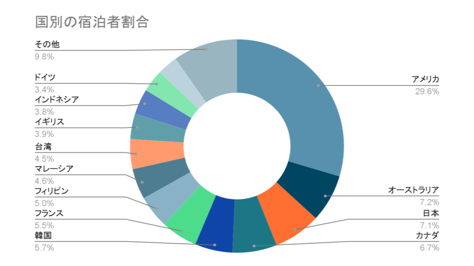 私たちの施設に宿泊されたお客様を対象に国別(※)の割合を集計しました。
