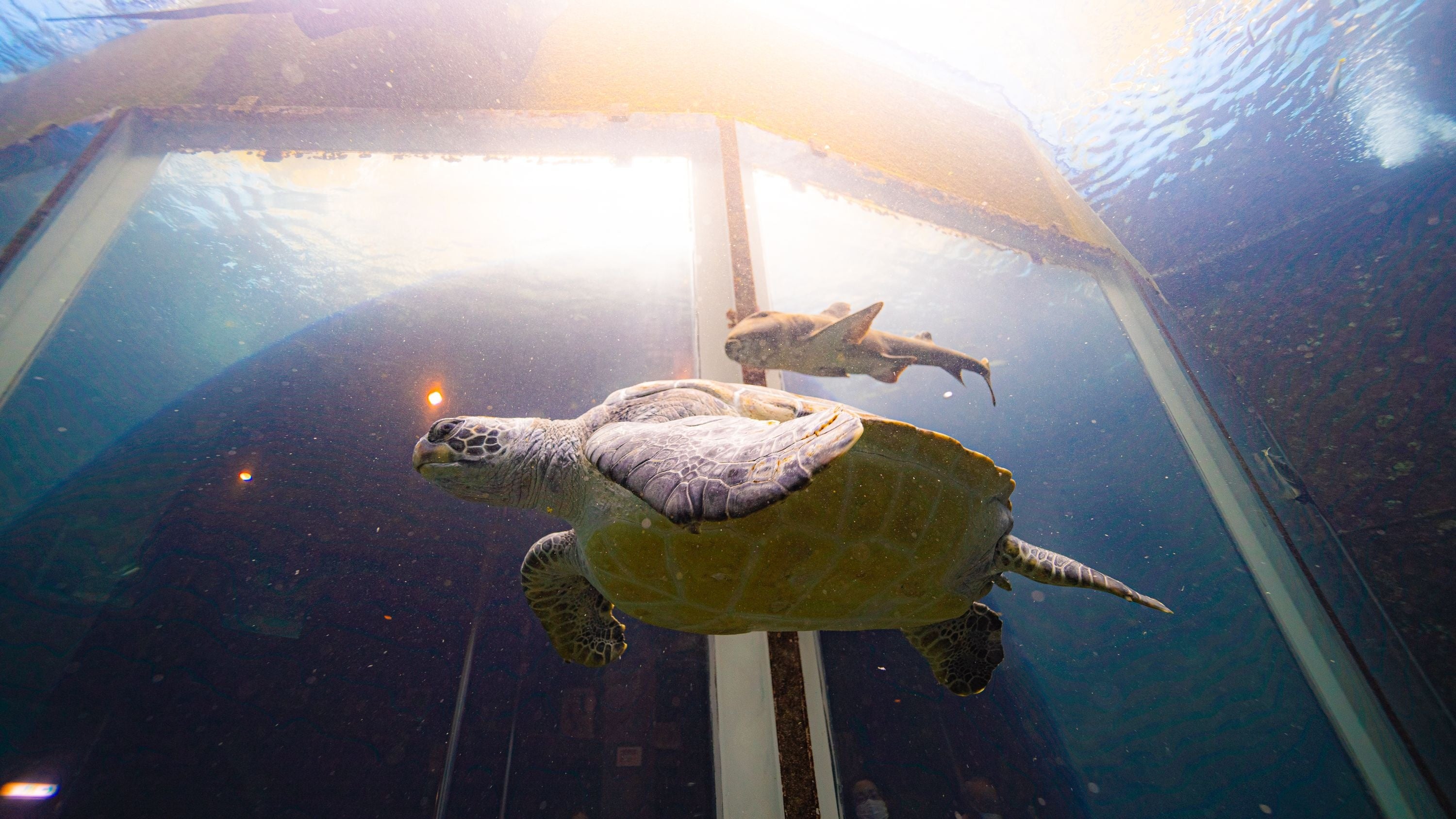 自然の入り江に浮かんだアクアドームペリー号は、総排水量1,300トンの船です。この中には水量600立法メートルの大水槽があり、伊豆の海の再現をテーマに魚類や無脊椎動物、海藻など50種10,000点もの生物が暮らしています。
