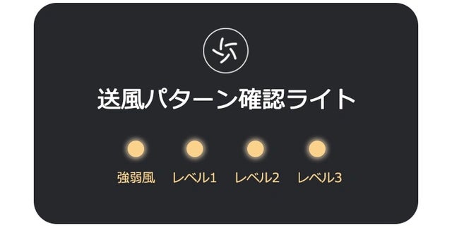 - 風量調節は4パターン搭載されており、(弱~強・弱・中・強)と、ボタン操作で切り替えることができます。