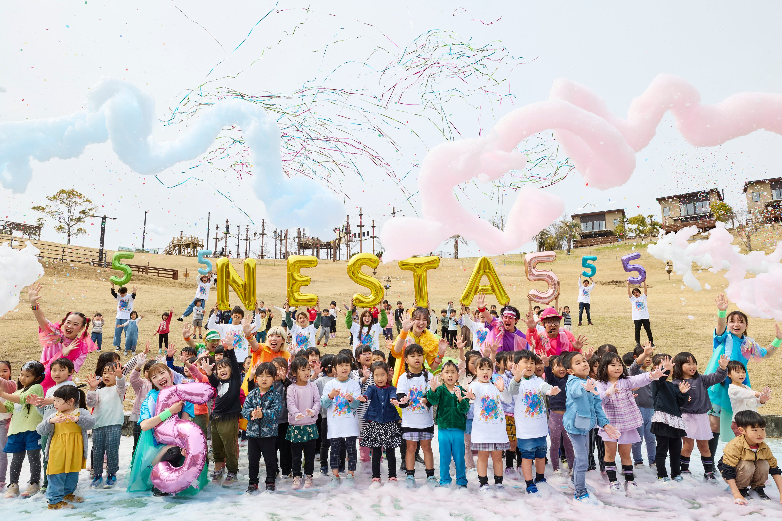 大自然の冒険テーマパークとして生まれ変わってから5周年を迎えることを記念して、本日10時30分よりオープニングセレモニーを開催し、この日ご招待した「ネスタリゾート神戸と同い年の5歳のお子様100人」と一緒に、5周年をお祝いしました。