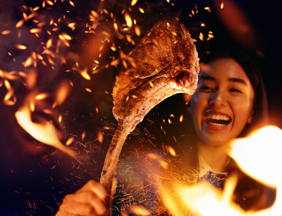 キャンプファイヤーの迫力を本能で感じ、巨大な骨付き肉をあぶって豪快に食らいつこう!