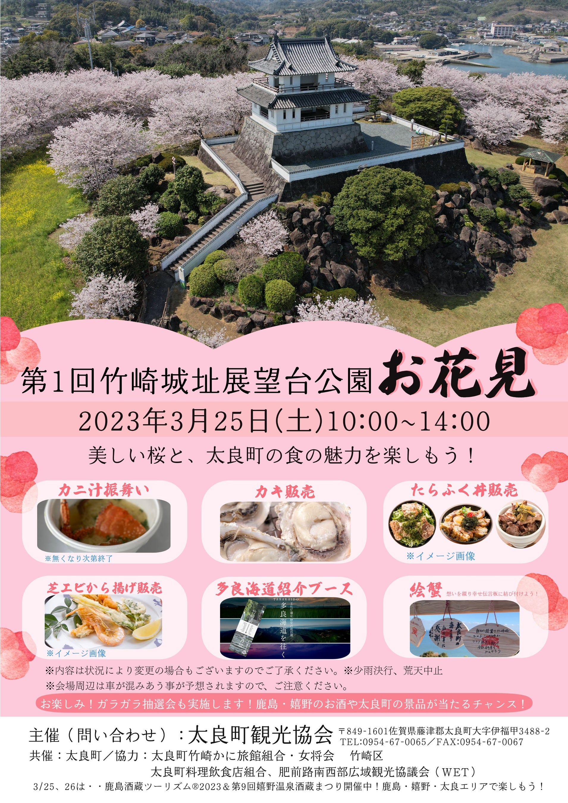 絶景の有明海ブルーと桜の淡いピンクが素晴らしいコントラストで魅了する景色、そして太良町の【食】を楽しんでいただくイベントとして、「第1回竹崎城址展望台公園お花見」を開催します。