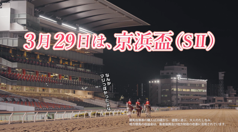 本日3月20日(月)に公開した動画では、南関東三冠レースの行方を占う重要なステップレース「京浜盃(SⅡ)」を、マジメな先輩ナイキスターゲイザとおふざけ気味の後輩コンビ、クリールマグナム&トロヴァオがお知らせします。TCK誘導馬3頭のクスッと笑える掛け合いにぜひご注目ください。誘導馬を演じた、人気声優の中井和哉さん、森久保祥太郎さん、八代拓さん3名による絶妙な声の演技も聞きごたえ抜群!声優ならではの「イケボ」は必聴です。