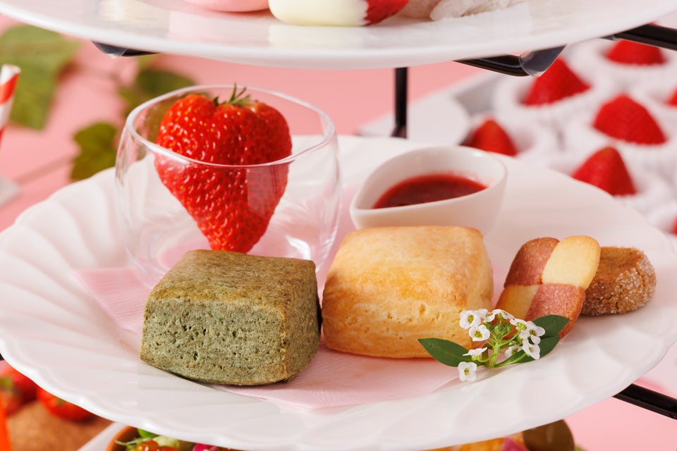 その他シェフこだわりのセイボリーには、添えられたグリーンピースのマカロンが目を引く、植木鉢仕立ての“クスクスのサラダ”や大阪産豚肉のリエットを挟んだ“バゲットサンド”などをご用意。いちごのクリームソーダのウエルカムドリンクとご一緒にぜひご堪能ください。