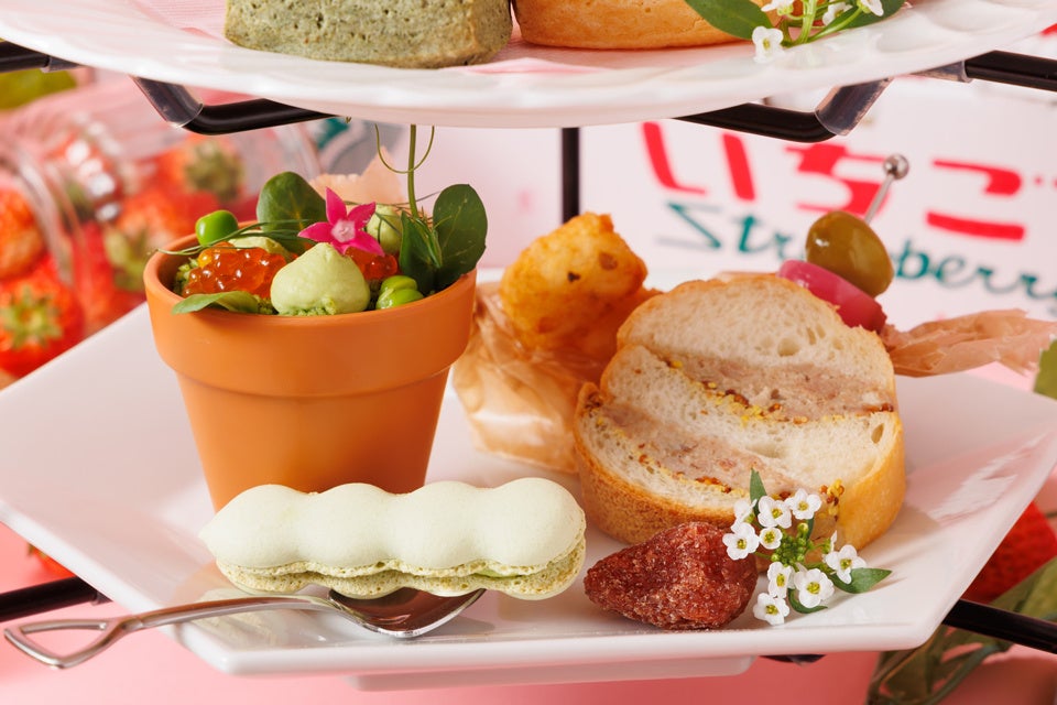 その他シェフこだわりのセイボリーには、添えられたグリーンピースのマカロンが目を引く、植木鉢仕立ての“クスクスのサラダ”や大阪産豚肉のリエットを挟んだ“バゲットサンド”などをご用意。いちごのクリームソーダのウエルカムドリンクとご一緒にぜひご堪能ください。