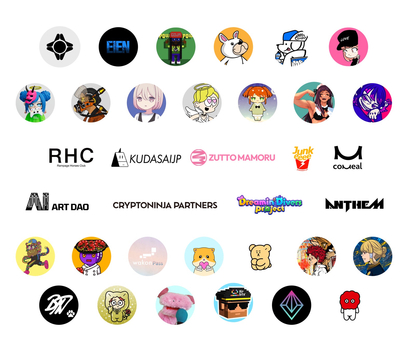 Moe☆Kono A.I.Party / More Kudasai / ZUTTO MAMORU / GlucoseMan / SNUG / META KAWAII / NEO TOKYO PUNKS / EIEN / JUNKeeeeS / MetaSmile / GOJA POW POW PEOPLE / French bulldogs NFT / Yoshioka / CryptoNinja Partners / comeal / Crypto Hamsters / What’s UP JOHN! / NAMAIKI GIRLS / WakonPass / Dreamin’ Divers Project / Keeei!! G.O.A.T Buddy’s / Rampage Horses Club / TokyoBraveHeroes / ANTHEM / EXO / 6maker / NFTFestival・BabyBunta / KawaiiGirlNFT / Naito cat’s pajamas / MetaKozo / ジト目ガールジェネラティブ / crypto bears (semashi) collection / hellnaheaven icon / Airbits / VERS(順不同)