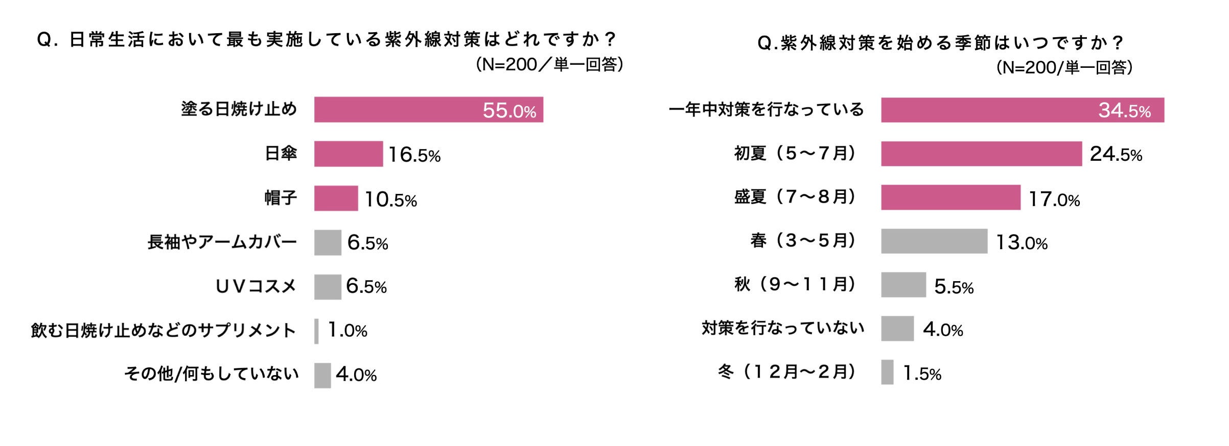 さらに、「紫外線対策を始める季節は?」の質問に対して、最も回答が多かったのは「1年中対策を行っている」(34.5%)