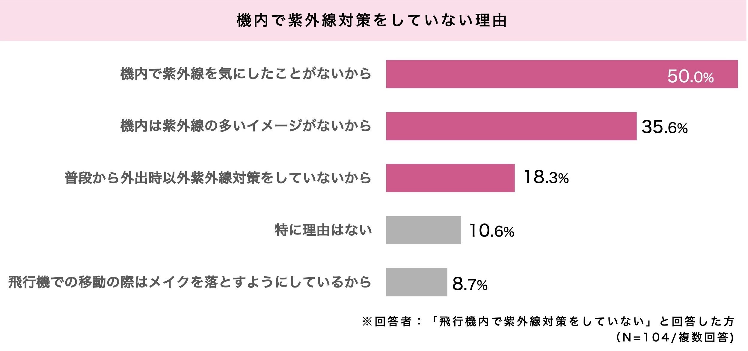 さらに、飛行機内で紫外線対策をしていないと回答した人に対して「飛行機内で紫外線対策をしていない理由」についても質問したところ、「機内で紫外線を気にしたことがない」「機内は紫外線が多いイメージがない」