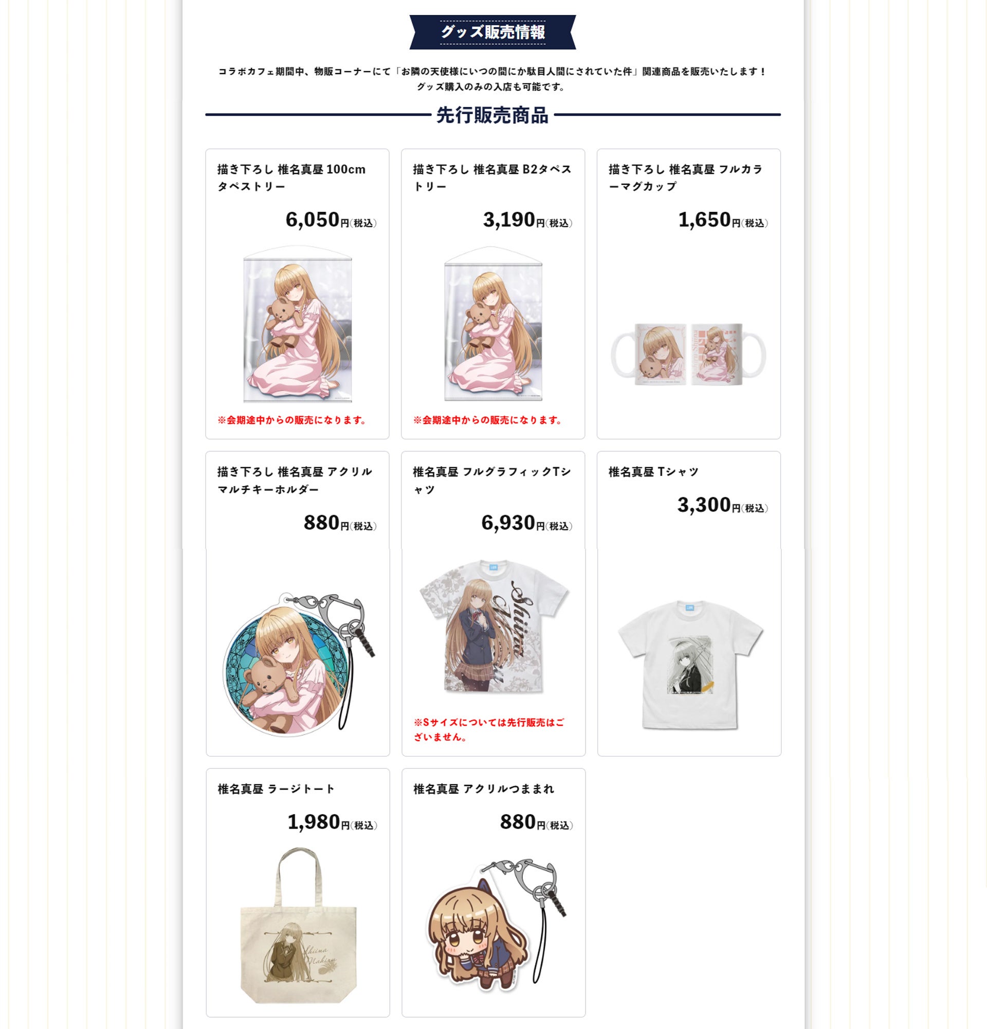 ・描き下ろし 椎名真昼 フルカラーマグカップ 価格:1,650円(税込) [発売:二次元コスパ] ・描き下ろし 椎名真昼 アクリルマルチキーホルダー 価格:880円(税込) [発売:二次元コスパ] ・椎名真昼 フルグラフィックTシャツ 価格:6,930円(税込) [発売:二次元コスパ] ※Sサイズについては先行販売はございません。