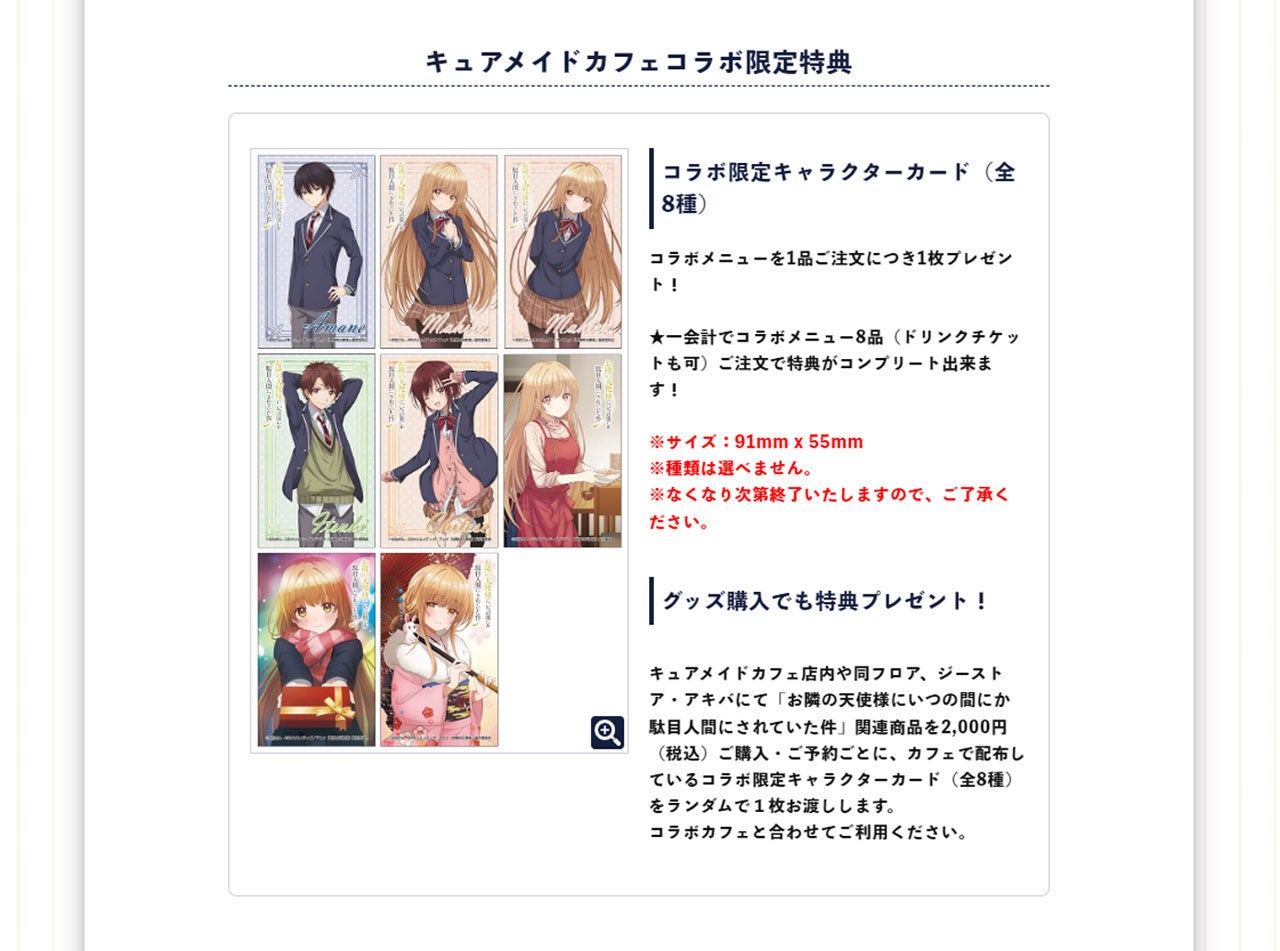 キュアメイドカフェ店内や同フロア、ジーストア・アキバにて「お隣の天使様にいつの間にか駄目人間にされていた件」関連商品を2,000円(税込)ご購入・ご予約ごとに、カフェで配布しているコラボ限定キャラクターカード(全8種)をランダムで1枚お渡しします。コラボカフェと合わせてご利用ください。