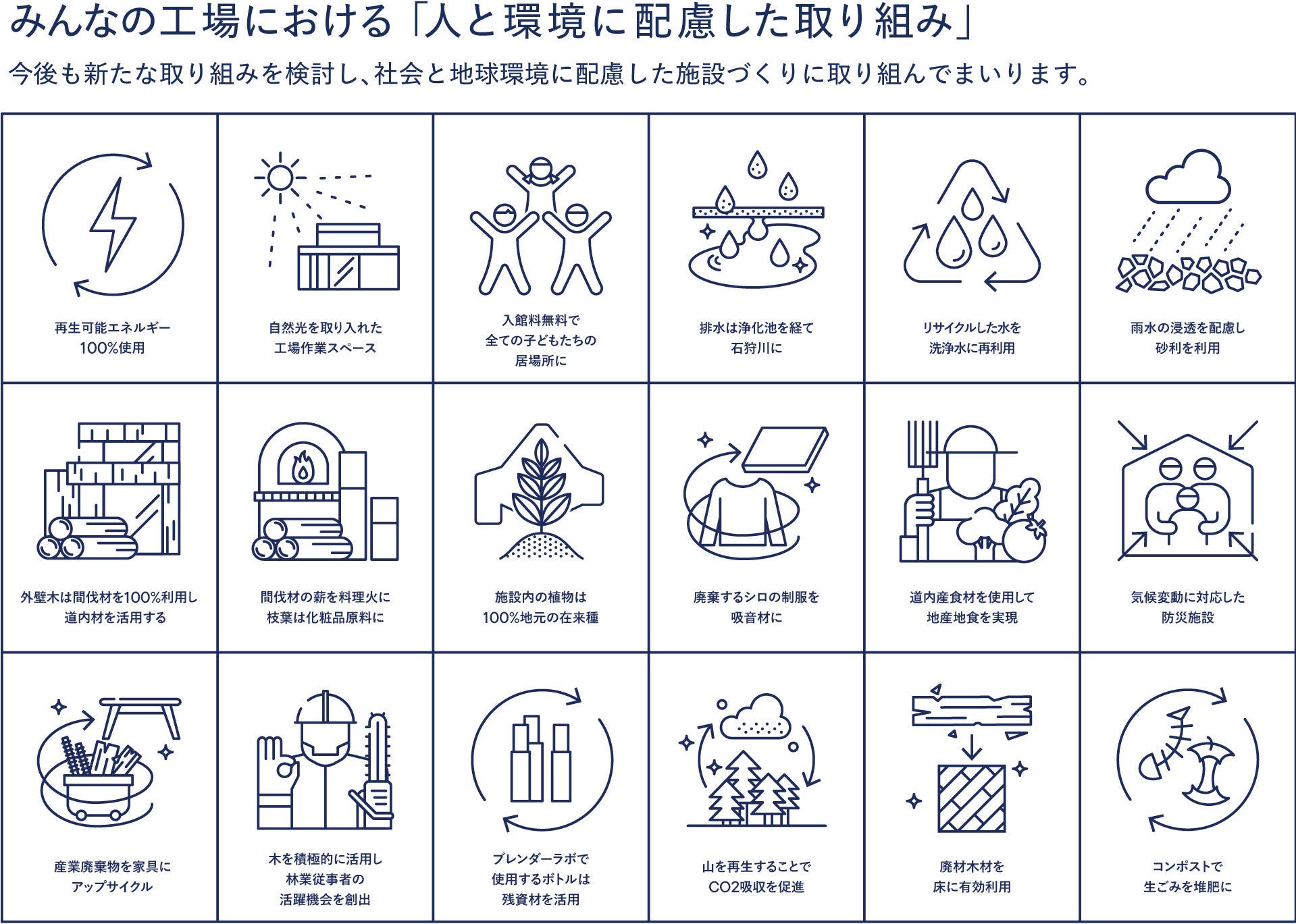 「みんなの工場」には、SHIROの製品を製造する工場に、ショップ、カフェ、キッズスペースとラウンジなどを併設した、人と環境に配慮した循環型の施設です。SHIROのものづくりをすべて見ていただけるよう、壁ではなくガラスで仕切り、「工場を開く」ことを実現いたしました。ショップ内のブレンダーラボではご自分のオリジナルの香りを実際の工場と同じ製法でつくれる、ものづくり体験が楽しめます。ピンネシリの山々を望みながらゆっくりと過ごせるカフェやラウンジ、子どもたちの自由な遊び場や、小さな図書館も完備しているこの場所が世界中のみんなの居場所になることを願っています。