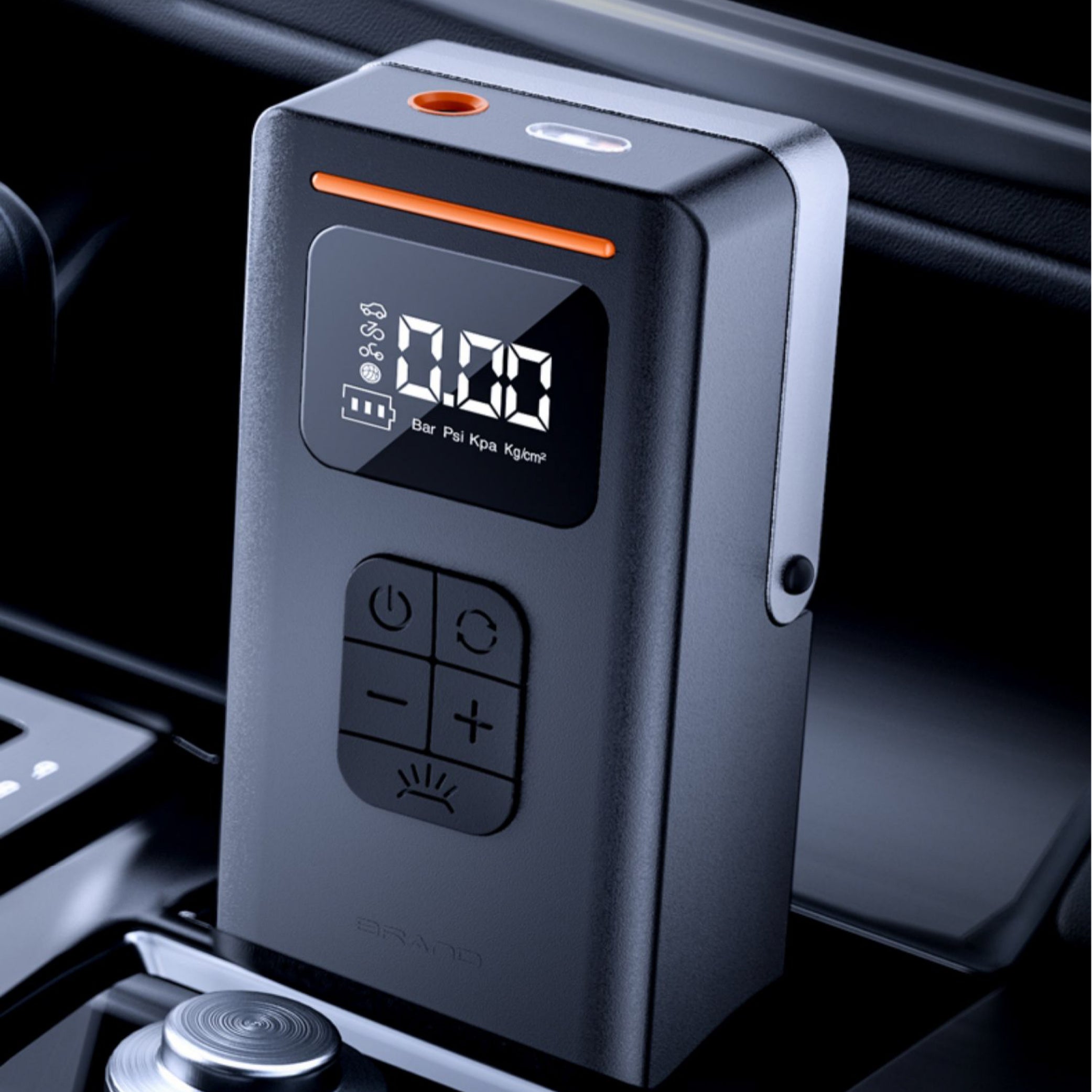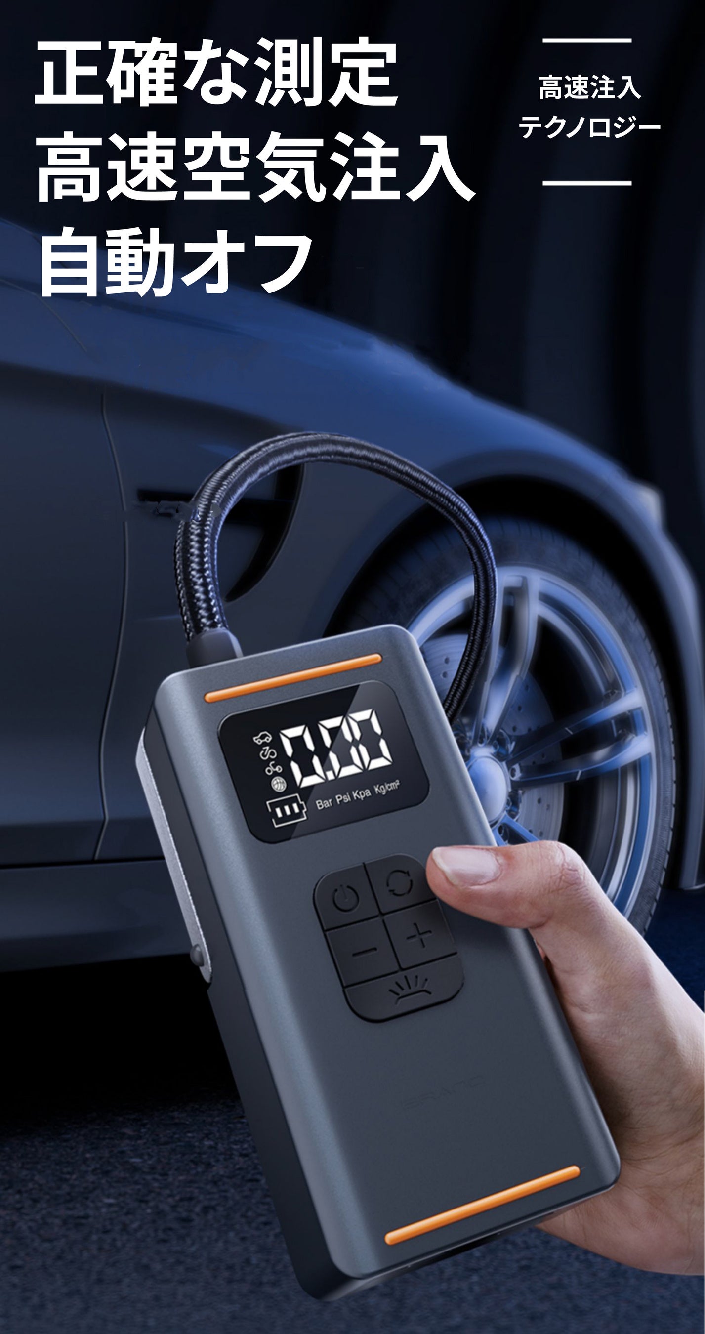 本体の前面には、4つの圧力測定単位(PSI, KPA, BAR, KG/CM)を備えた大きなデジタル表示画面を備えているため使用時に常に空気圧を確認できます。