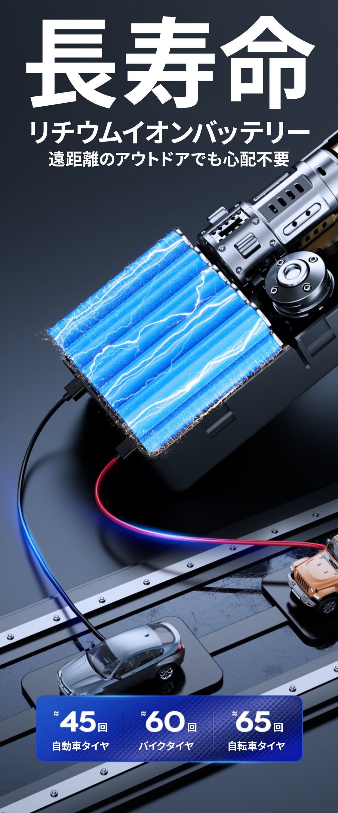 6000mAhの大容量バッテリーなので、満タンに充電した後であれば、最大4台の車のタイヤに空気を入れることができます。