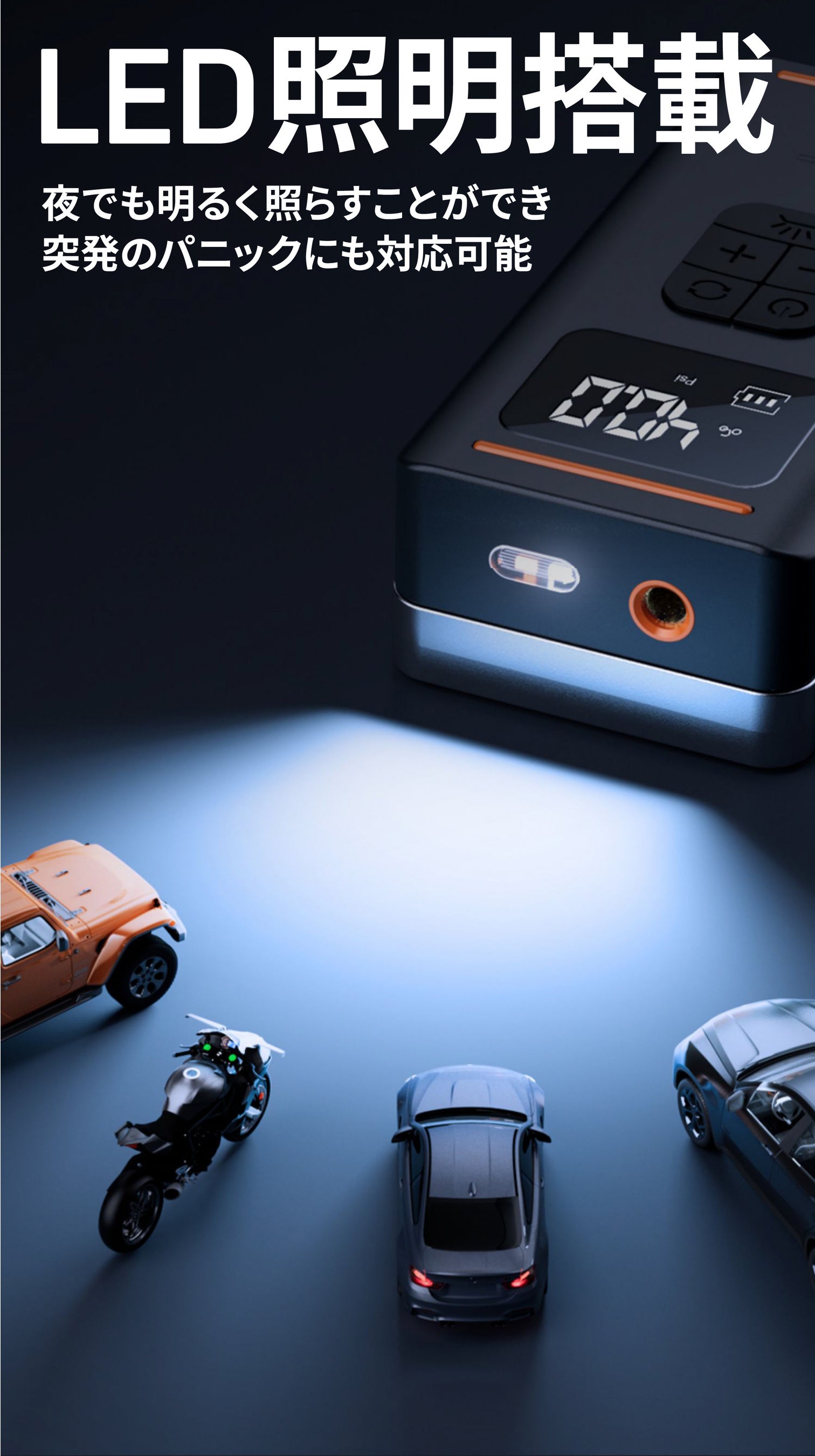 夜間走行中に急にタイヤの空気が抜けてしまった…なんて時でも安心。