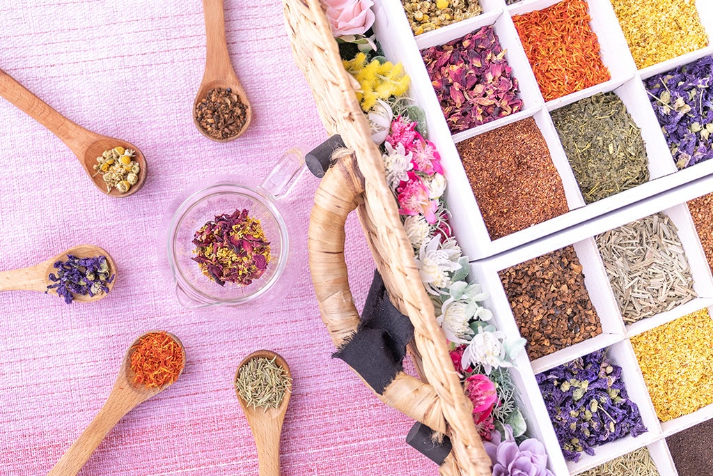 数種類の花びら、ハーブの香り。自分だけのオリジナルハーブティを作ろう!見た目もカラフルなビュッフェを仲間と共に楽しんで、身体に良いものを取り入れる。それぞれの花びらの効能も見ながらブレンドするのもおすすめ!花びらビュッフェはその他プランでも追加オプションとしてお持ち帰りのみ可能です。